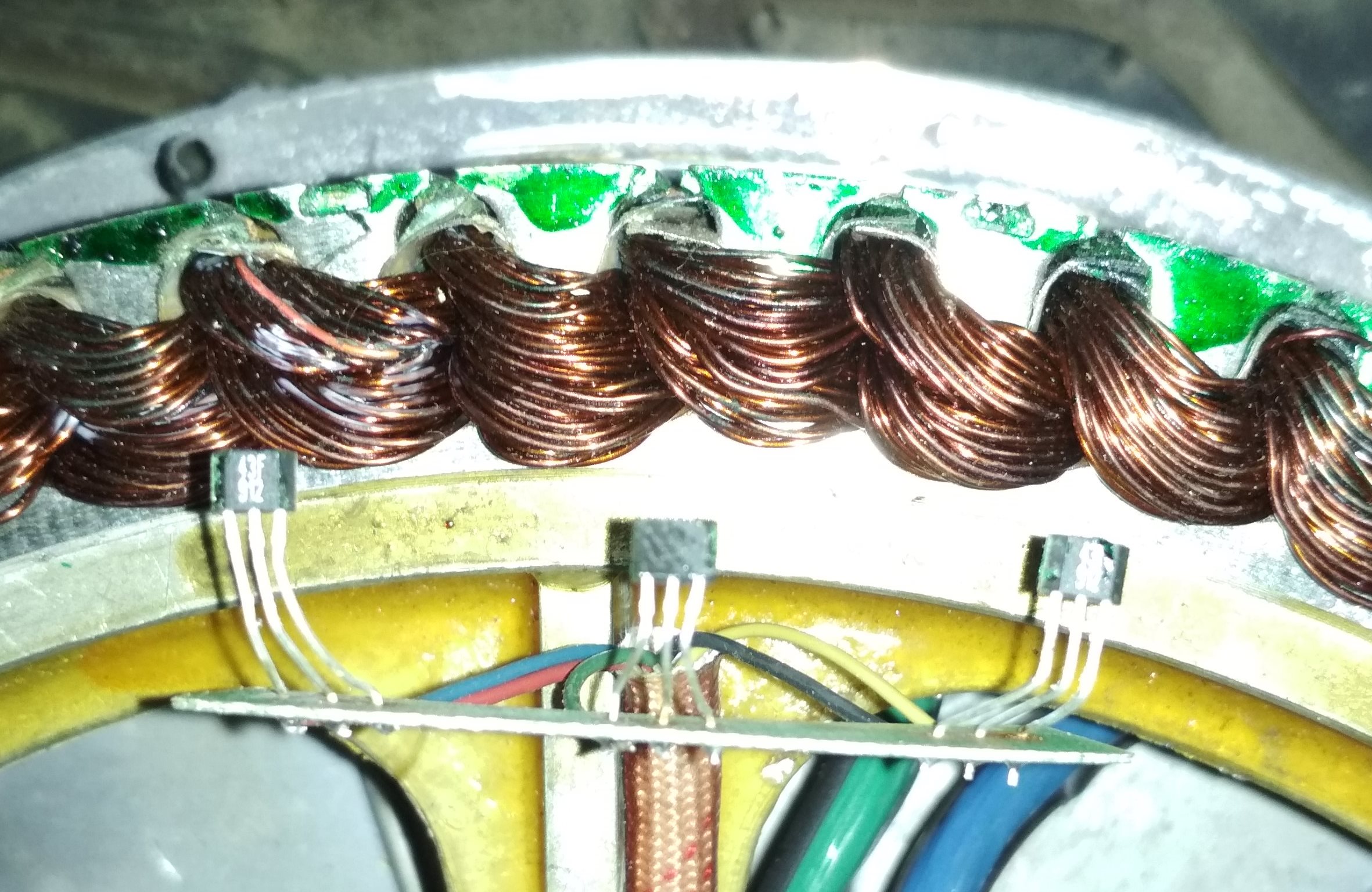 Ich habe jetzt trotzdem schon mal den Motor wieder aus einander genommen und die Hall Sensoren gelöst (ging relativ leicht). Seltsam ist mir erschienen, dass der mittlere Sensor mit der Beschriftung nach innen eingebaut war (die Äusseren mit der Beschriftung nach aussen). Ist es egal wie herum die da drin stecken?