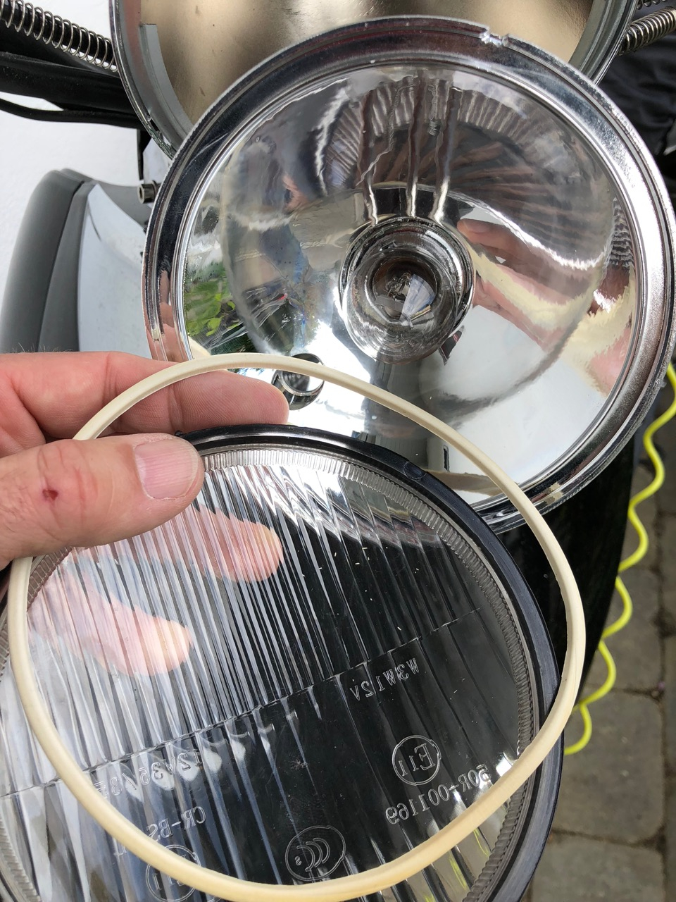 Die Dichtung (weiß) und das Glas mit dem Reflektor wieder zusammenfügen. Darauf achten das die Nase des Glases in die Nute des Reflektors passt. Danach den Reflektor mit Glas, an der Markierung ausrichten und mit dem Metallring wieder festschrauben. Das war es, nun ist die Schrift auf dem Scheinwerferglas richtig zu lesen.