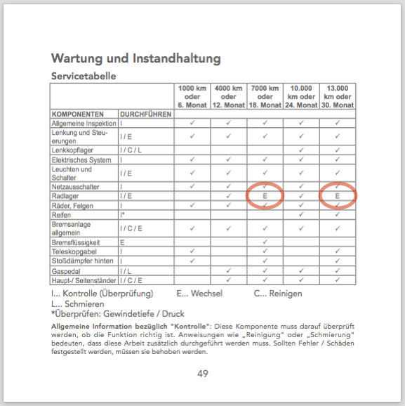 Dabei ist mir in der Servicetabelle in der Bedienungsanleitung aufgefallen, dass diese vorschreibt, dass man nach 18 Monaten oder 7.000 km (und dann schon wieder bei 13.000 km / 30 Mon.) die Radlager tauschen muss: