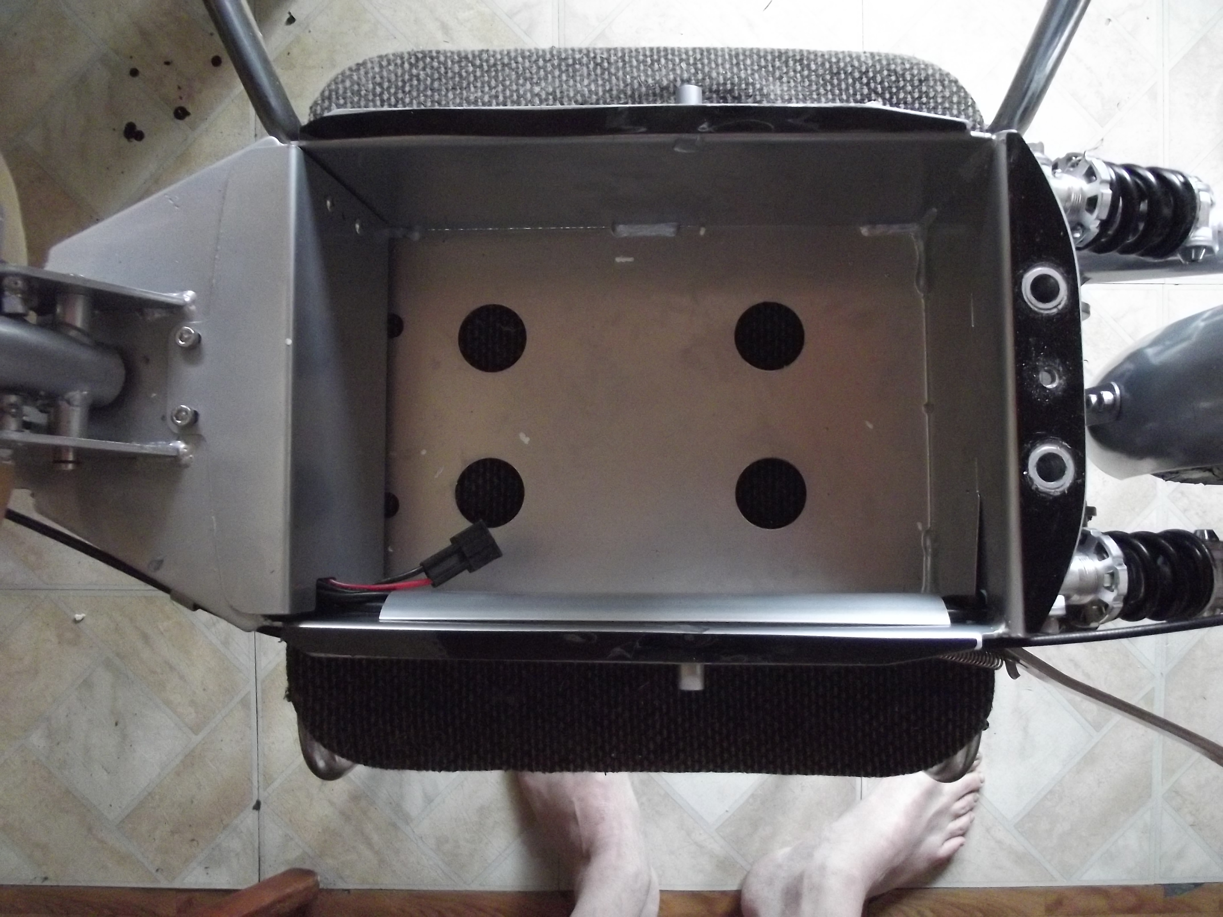 Für Regenfahrten nicht geeignet? Nun ja, man wird halt bei Regen selber nass. Aber dagegen hilft ein Regencape. Beim Revoluzzer 2.0 ist das unproblematisch. Bei meinem 2.0 aus 2017 sind Controller und 12 Volt Wandler Regenwassergeschützt vorne am Akkukasten untergebracht und es gibt keine Öffnungen an der Frontseite des Akkukastens. Auf der Unterseite des Akkukastens, also dort, wo sich der Akku befindet, sind vier große Löcher. Keine Ahnung, wozu diese dienen. Vermutlich, um Schwitzwasser zu vermeiden oder so. Wird schon einen Sinn haben, denn andere Scootermodelle wie Forca, Mach1 und so weiter, haben das auch. Aber ein Akkupack wird in einer spritzwassergeschützten Tasche geliefert und damit in dem Akkukasten versenkt. Also, wo ist das Problem. Wer ganz vorsichtig ist, legt sich noch eine alte Plastiktüte dazwischen.