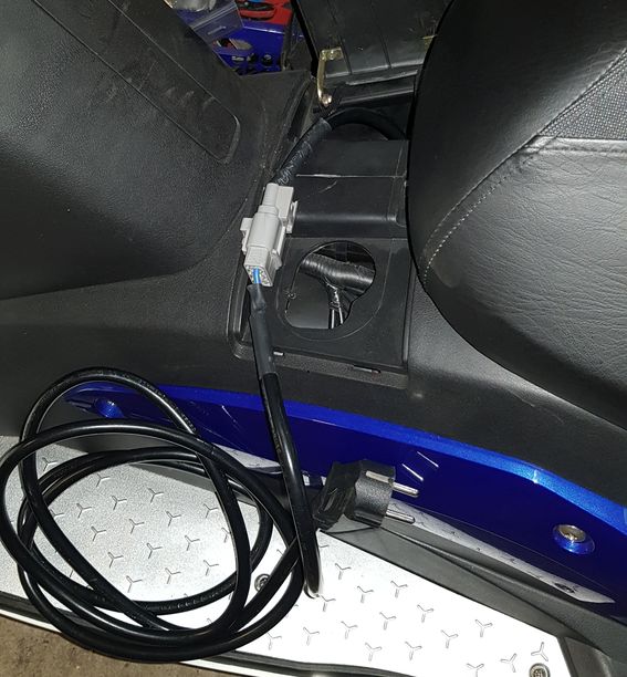 So sieht es aus. Entweder stopft man das komplette Kabel - incl. Zwischenstecker - irgendwie unter die Verkleidung, oder man trennt am grauen Stecker, und muss dann nur ein kurzes Stück Kabel unter der Klappe verstauen. Das restliche Kabel kommt dann entweder unter die Sitzbank oder bleibt in der Garage.