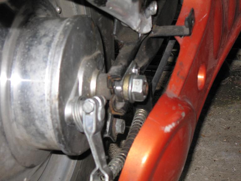 Von einem anderen Roller gab es hier ein Bild (weiß der Geier mal wieder in welchem Thread das war), das zeigte eine ähnliche Konstruktion, wobei die Drehmomentstütze rechteckig war und sich daher mit den kompletten Kantenlänge an den Wölbungen der Schwinge abstützen konnte. Damit muß dann die kleine Mutter mit 10er-Kopf keine vertikalen Kräfte abfangen, sondern nur etwas die horizontalen, den Rest macht die Drehmomentstütze gegen das Schwingenblech.