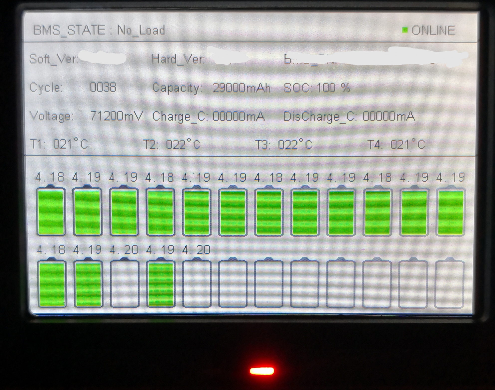 Es steht ja SOC 100% (also Akku voll). Wahrscheinlich ist er am Ballancieren und hat die vollen Zellen (mit 4,20V) von weiterer Ladung getrennt, bis die anderen Zellen mit 4,18V und 4,19V angeglichen sind.