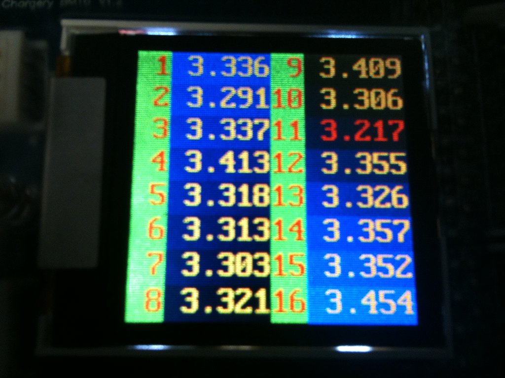 Sie hängen jetzt am Originallader incl. Balancer bei 1,9A und 420Watt. Der Ori hat 73VDc/5A. Dies sind 3,65V/Zelle. Der Schwellenwert der Balancer hatte ich für den TDler mit 3,60/3,61V festgelegt. Wenn der Ori-Lader also 3,65V/Zelle bringt sollten die Dicken/LEDs bis auf Zelle 11 reagieren.