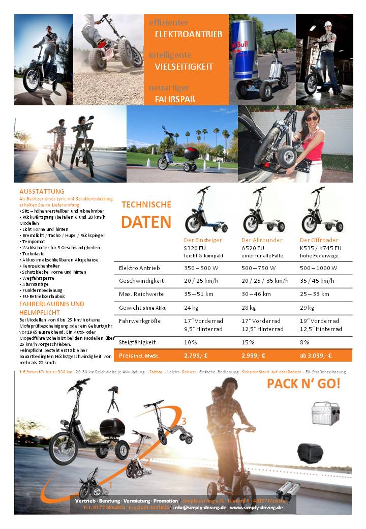 anbei der Vollständigkeit Halber noch das Prospekt von dem "blauen" Dreirad auf den Bildern. Es hat eine Pendelachse und einen engeren Radstand. Geschwindigkeiten von 20-45 km/h sind möglich, und am meisten Spaß macht er wenn man es im stehen fährt, ein Sitz ist aber auch dabei.