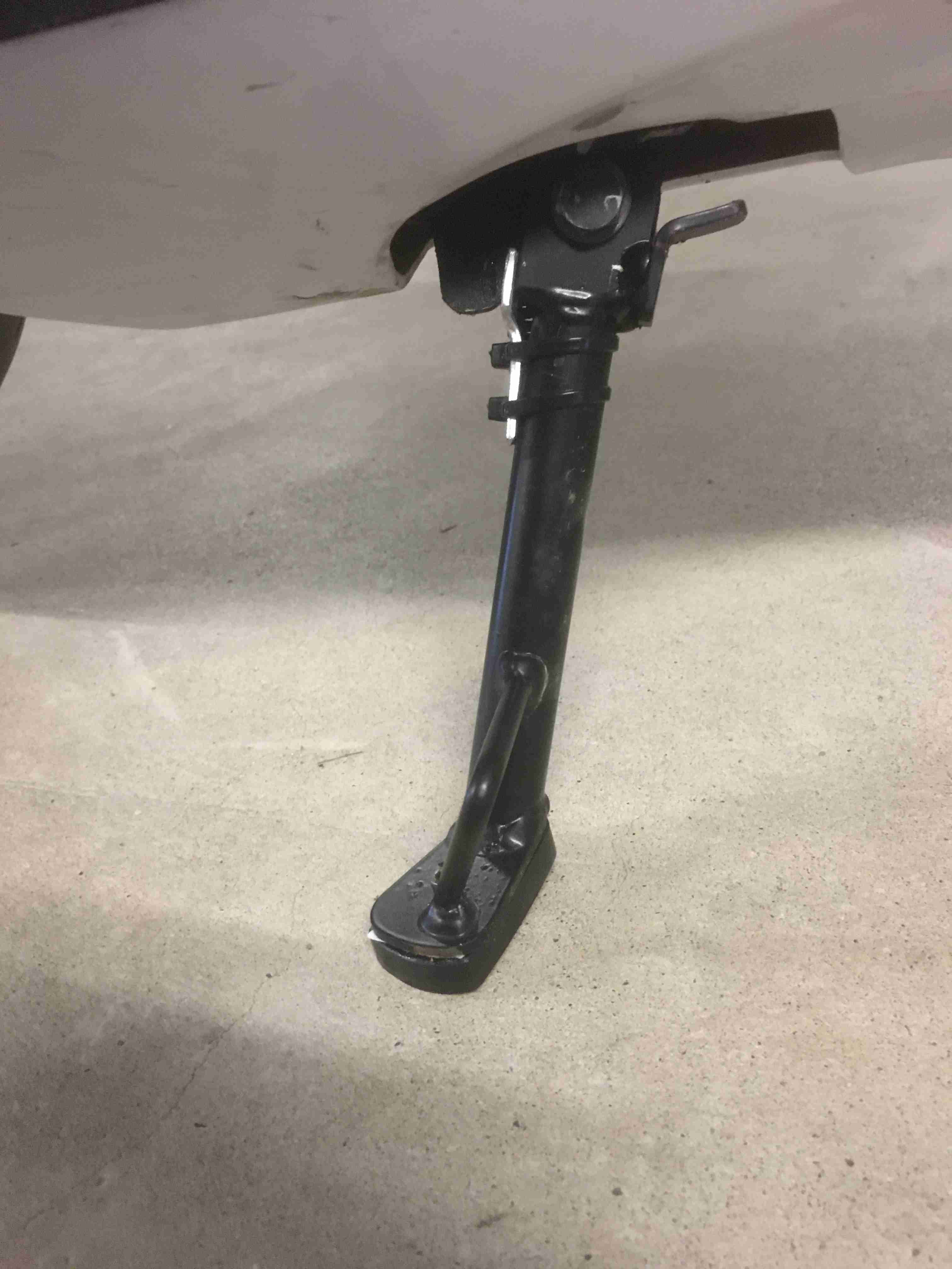 Beim S01 ist recht viel Gewicht hinter dem Seitenständer (Akku, Motor). Mit der 3mm Unterlage wird dies ein wenig verbessert.
