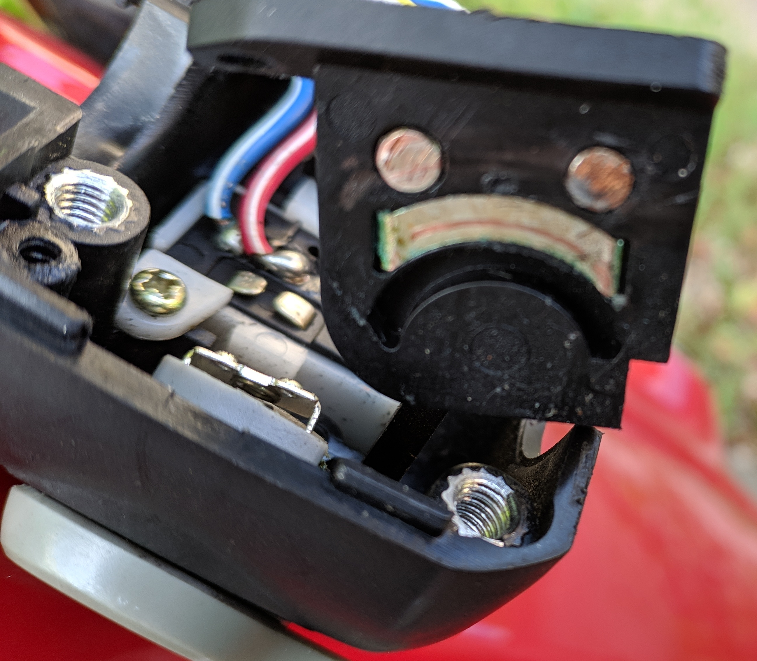 bei meinen 2017er N1s habe ich das gleiche Problem mit dem sporadischen Geschwindigkeitseinbruch. Bei mir trat der Fehler allerdings meistens morgens ein paar Kilometer nach dem losfahren auf (Ladezustand im 90er Bereich). Den Rest des Tages war es dann wieder ok. Das erste Mal hatte ich es vor ca 2 Jahren über einen Zeitraum von ca 2 Wochen und dann wieder im letzten Sommer für einige Zeit. Hier im Forum wurde mal der Verdacht geäußert, es könnte der Geschwindigkeitswahlschalter sein (noch Drehschalter, nicht Wippe) der ein Feuchtigkeitsprobkem hat und dann sporadisch von 3 auf 2 umschaltet. Ich habe den im letzten Sommer gereinigt und zumindest bisher kein Problem wieder gehabt. Wie man auf dem Bild sehen kann, war hier schon etwas Grünspan an den Kontakten :shock: Wenn ich die Schakterlogik richtig verstanden habe, ist der mittlere Kontakt entweder mit 1 oder 3 über die Wippe verbunden. Offen heisst dann in der Mittelsrellung 2. Somit wäre es schon logisch, dass bei einer kurzzeitigen Kontaktunterbrechung von 3 auf 2 umgeschaltet wird und die Geschwindigkeit entsprechend einbricht. Allerdings müsste dies evtl auch im Display für die Fahrstufe angezeigt werden, was mir jedoch nicht aufgefallen ist.