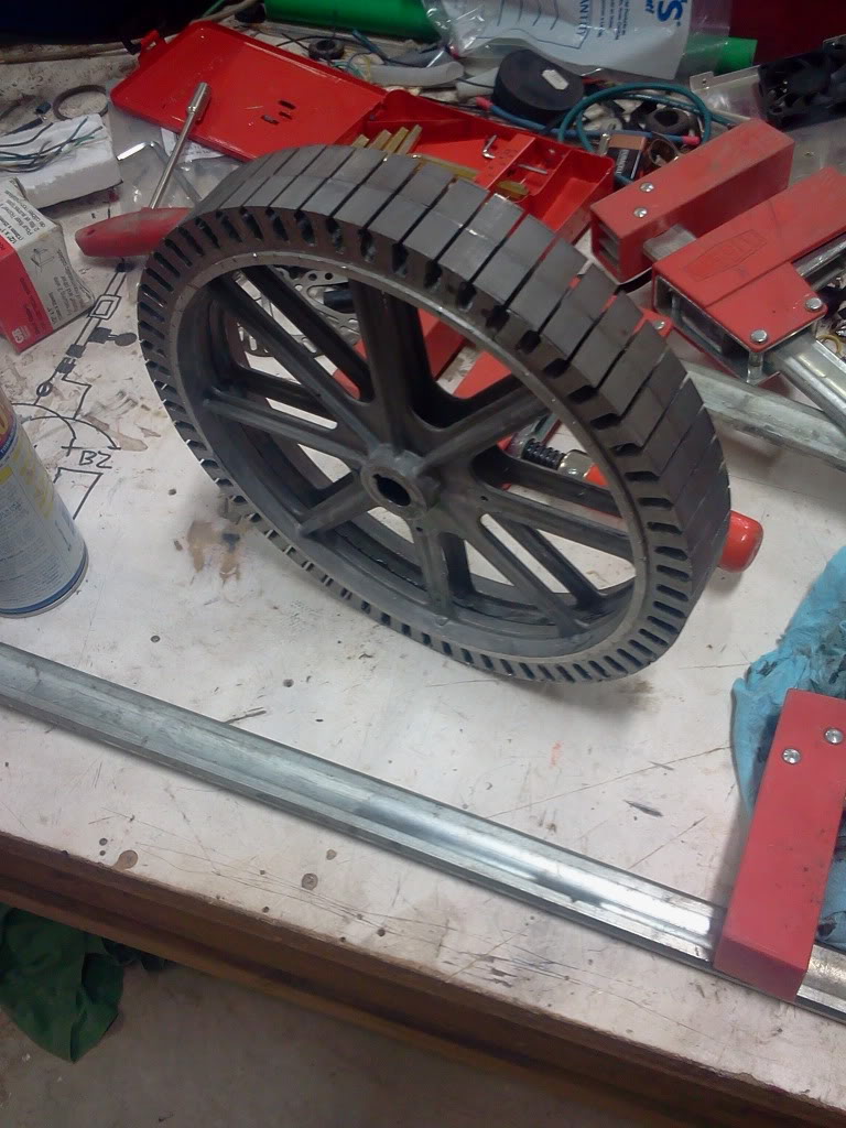 (Wenn man jeden zweiten Magneten raushaut und anders herum wieder einbaut, insofern sie nicht gekehlt sind, wird aus einem 20-poligen Motor ein 10-poliger also doppelte Drehzahl, es wäre dann NN, SS, NN, SS usw., eventuell müssen aber die Hallsensoren versetzt werden, sie haben meist 120° elektrisch, ich würde sie dann auch mechanisch 120° am Umfang anbringen).