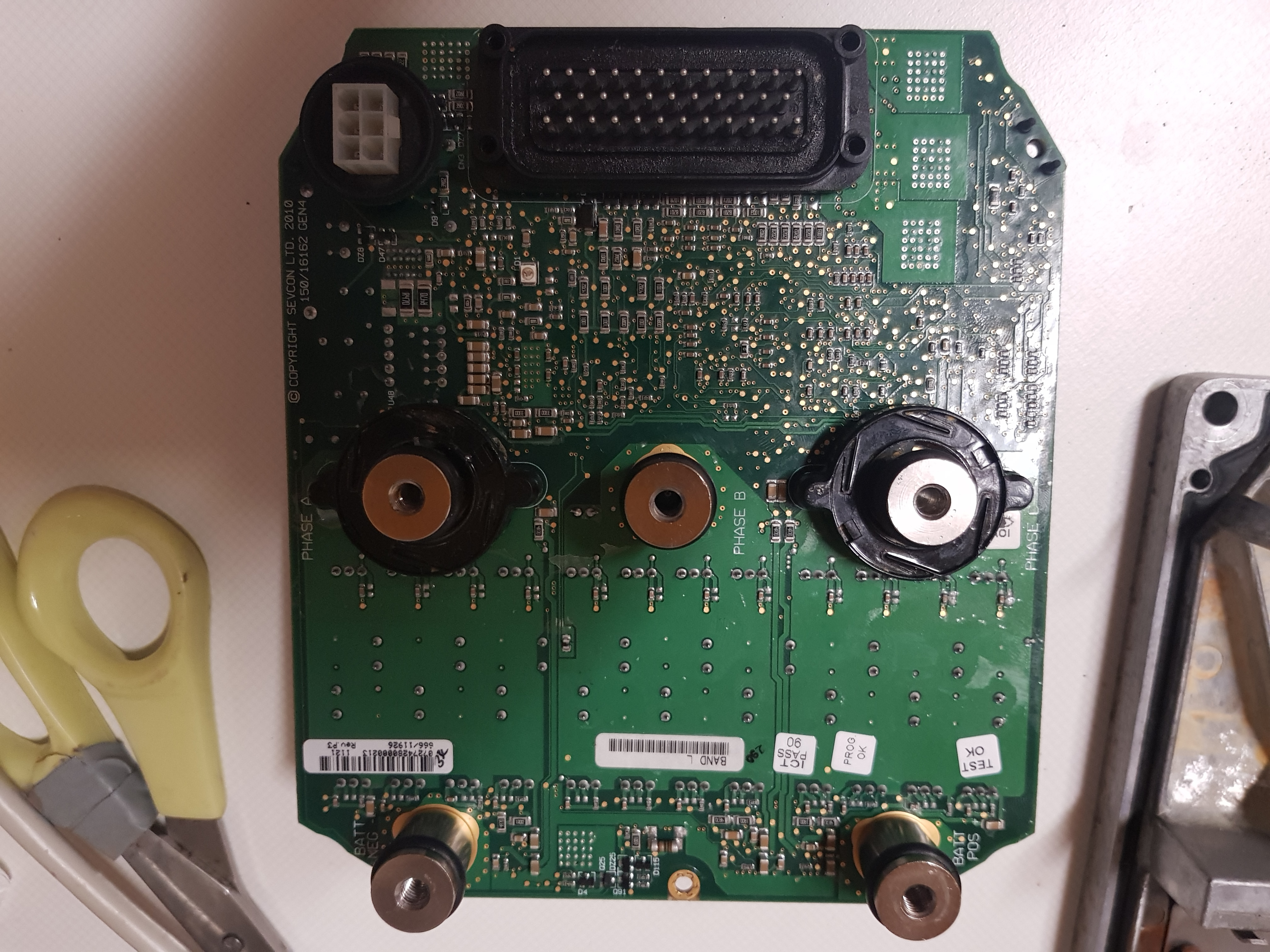 Zum schauen ob der Motor wieder dreht, würde ich keinen Aufstand machen das Ding ordentlich zusammenzubauen? Ist doch nur Wärmeableitung. Kurz Motorkabel und Batterie mit1,5 mm2 verlängern und rantüdeln und den Stecker einstecken. Wenns geht kann man sich rumärgern, ansonsten Sevcon Weitwurf, die Dinger fallen doch regelmässig aus weil Peugeot zu doof war.