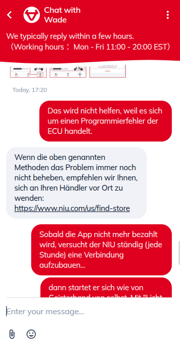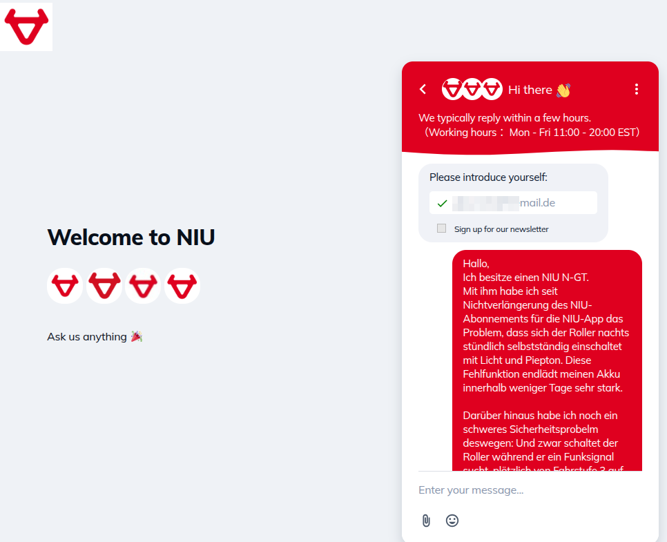 Man soll also seinen Roller über diese eMail-Adresse vom NIU Smart-Service löschen lassen können. - Ob 's hilft?