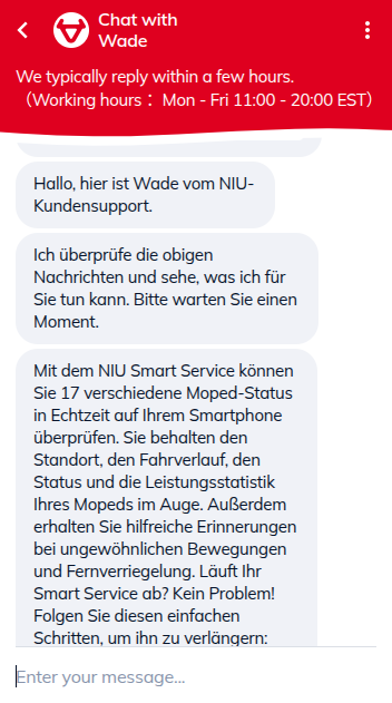 Hallo, hier ist Wade vom NIU-Kundensupport.Ich überprüfe die obigen Nachrichten und sehe, was ich für Sie tun kann. Bitte warten Sie einen Moment.Mit dem NIU Smart Service können Sie 17 verschiedene Moped-Status in Echtzeit auf Ihrem Smartphone überprüfen. Sie behalten den Standort, den Fahrverlauf, den Status und die Leistungsstatistik Ihres Mopeds im Auge. Außerdem erhalten Sie hilfreiche Erinnerungen bei ungewöhnlichen Bewegungen und Fernverriegelung. Läuft Ihr Smart Service ab? Kein Problem! Folgen Sie diesen einfachen Schritten, um ihn zu verlängern: