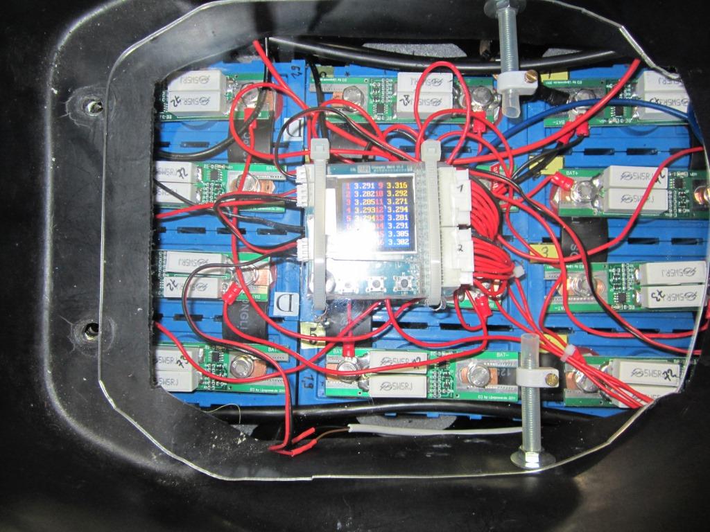 In Bild 3 sieht man gut die Einzelspannungen der16 Zellen im Monitor und den verbauten Temperaturfühler.