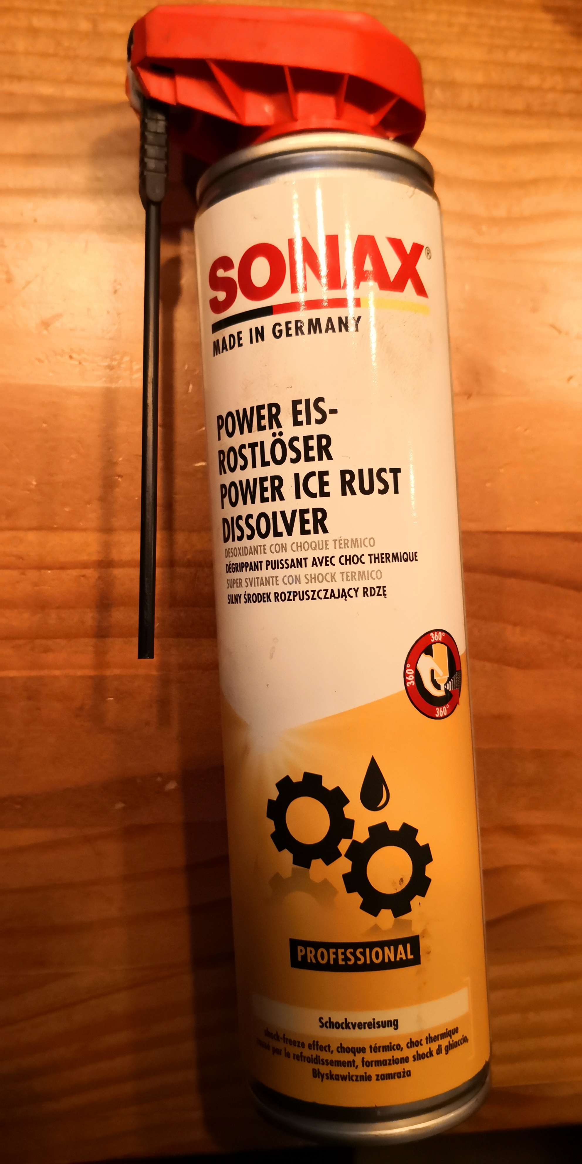 Zuerst unters Auto den neuen Rostlöser ausprobiert. Kannte ich auch noch nicht , also mit Vereisungstechnik und so. Und was soll ich sagen, super Produkt. Langer Schnorchel zum Klappen dran, da kommt man auch überkopf punktuell dahin wo es hin soll und saut nicht alles ein. Gerade am Wellrohr/Kat sollte man mit allen brennbaren Materialien sparsam und vorsichtig sein, sonst Brandgefahr bei der anschließenden Probefahrt. Also punktuell einsprühen und sofort Überschuss abwischen. Dann habe ich den Rostlöser erstmal mehrere Stunden einwirken lassen.