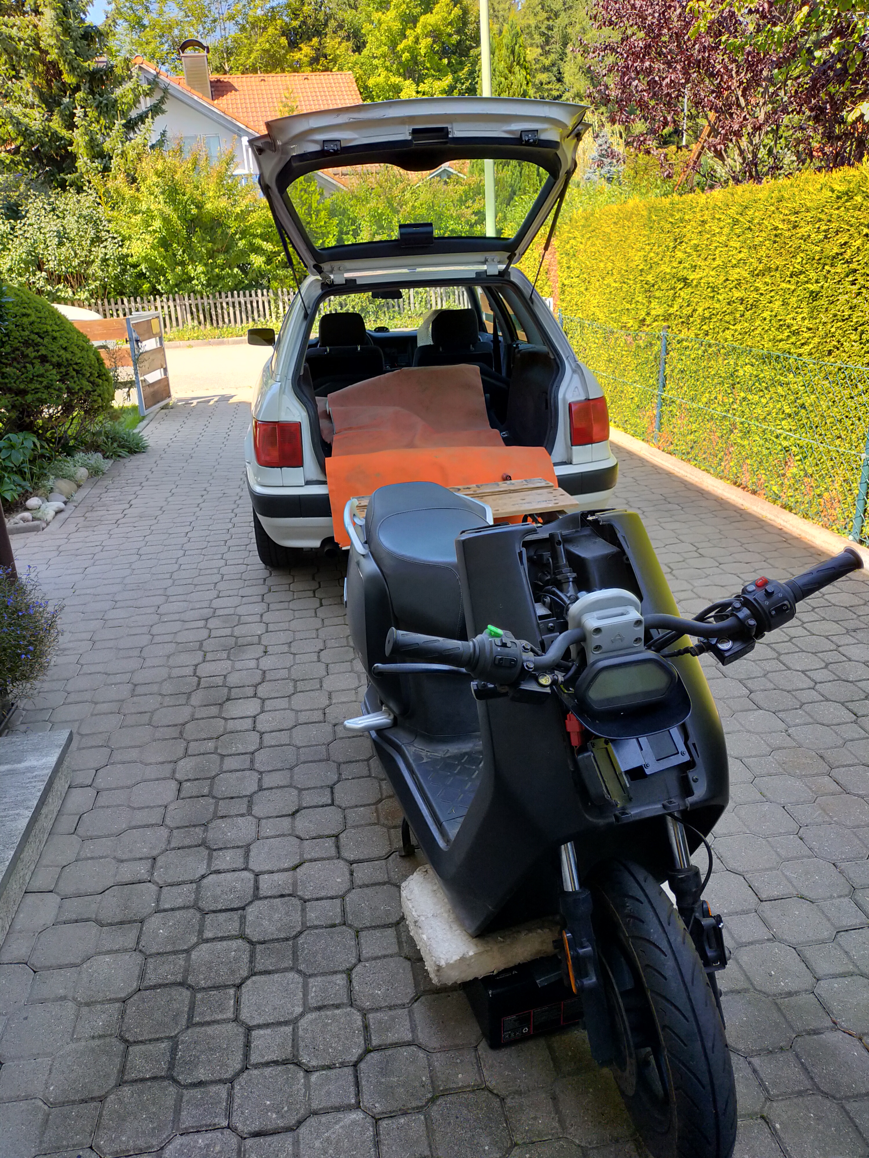 Nachdem dieser neu erworbene gebrauchte Niu jetzt gern morgen 700 km fahren möchte, hat er sich in mein Auto schlafen gelegt. Besser gesagt habe ich die geschossene Beute in den Kofferraum geworfen und festgezurrt.