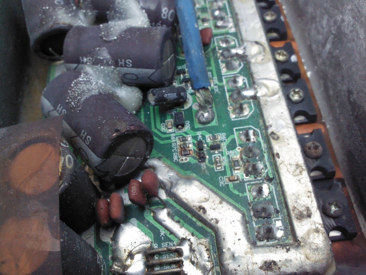 Besagte Überschwemmungs-Ecke unten links beherrbergt sehr ungesund / verschmort aussehende Widerstände. In der Gegend sollte aus meiner Sicht eine genauere Analyse der Bauteile und Leiterbahnen erfolgen.