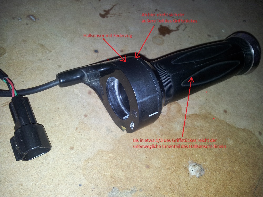 Der äußere drehbare Gasgriff besteht daher nicht einfach nur aus einem Gummiding welches sich einfach nur abziehen lässt, sondern ist mit einem innenliegendem Federzug des Hallsensors (Drehpotis) fix verbunden.