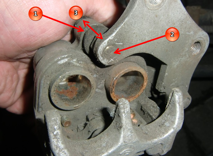 Im Bild 1 sieht man die Schwimmsattelbremse vom Alfred, der Bremssattel ist beweglich mit der Platte über die Stifte (2) verbunden und kann sich in Richtung (3) hin und her bewegen oder "schwimmen". Die Stifte werden durch die Gummis (1) geschützt. Diese Gummis meinte Peter. Bei einer Inspektion der Bremse ist die freie Beweglichkeit des Bremssattels und der Zustand der Gummis zu prüfen. Wenn der Bremmsattel nicht mehr leicht beweglich ist, kann es zum einseitigen Verschleiß der Beläge kommen, da die Bremsbeläge nicht mehr richtig in die gelöste Stellung zurückfahren können.