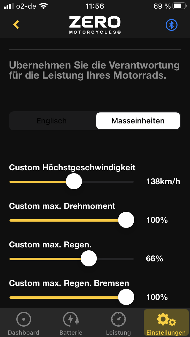 Die Höchstgeschwindigkeit ist bei meiner 11kW Variante auf 138km/h limitiert. Ich kann zwar den Schieber ganz nach rechts schieben, aber beim nächsten Aufruf der Custom Einstellungen steht es wieder auf 138.