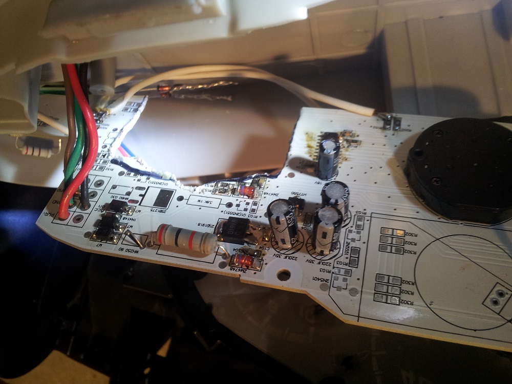 habe herausgefunden, daß der Strom über das rote Kabel bis an die Platine geht und dann über den gemeinsamen grünen Minus retour Was man schön sieht ist, daß hier an der Platine nicht besonders professionell Änderungen vorgenommen wurden. Vermutlich dienen diese dazu das Spannungsniveau an die Anzeige anzupassen.