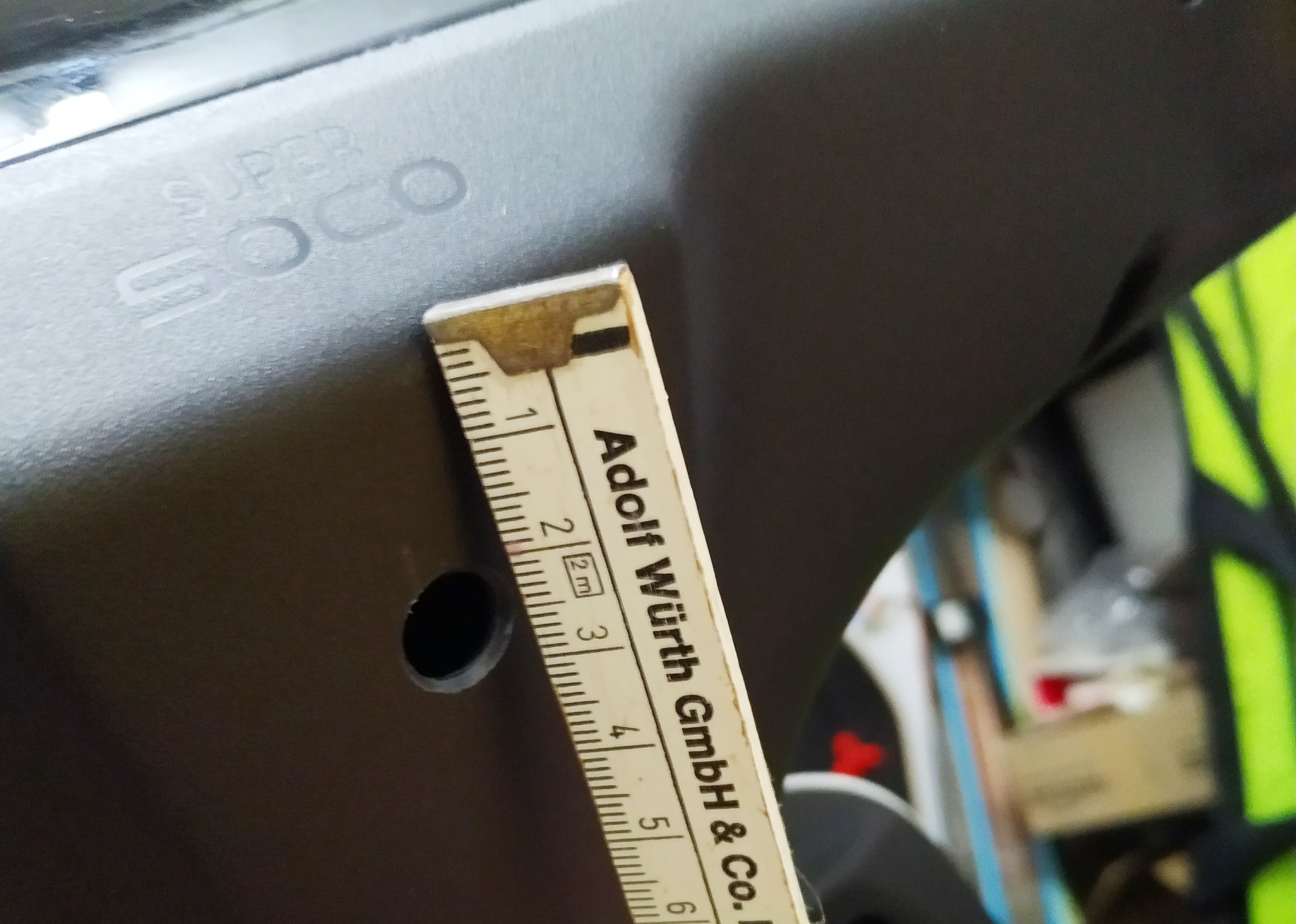 ca. 46mm zur Lochmitte von der Oberkante Lenksäulenblende (Foto Schiebmesser) bzw. ca 25mm vom Radius Kante zur Lochmitte (Foto Zollstock).