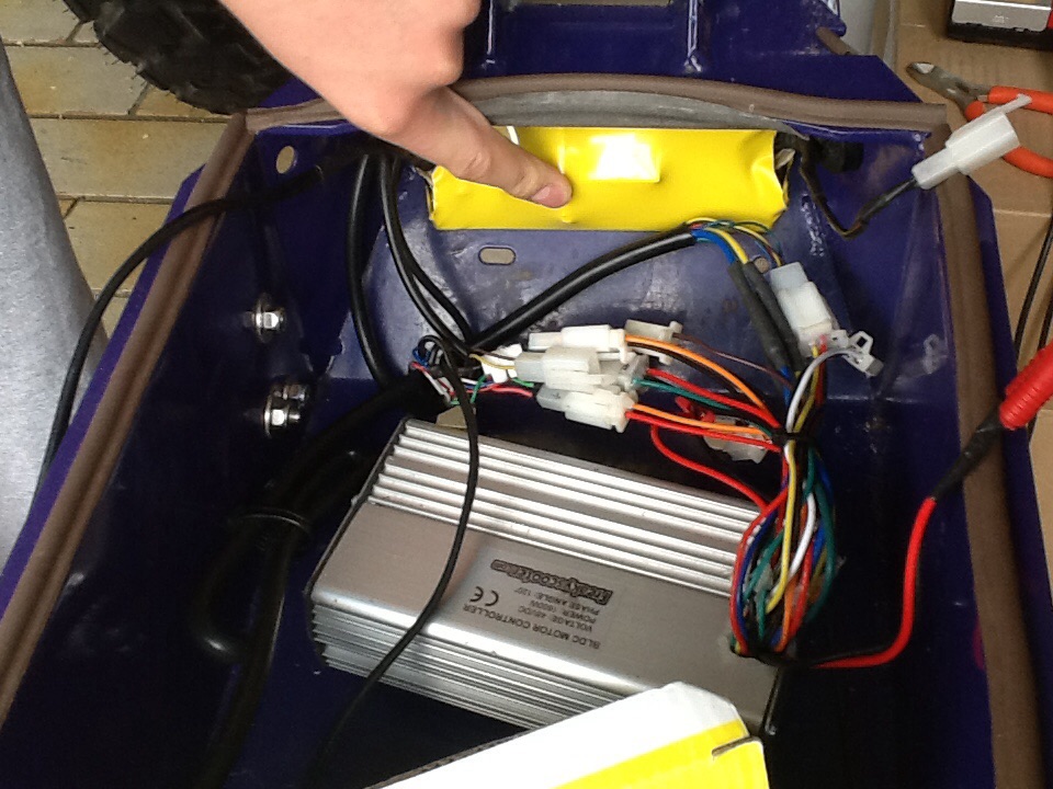 jedenfall mit viel Klebeband die Unterseite abkleben (240V Wechselstrom am Roller ist nich so angenehm :P)und dann einen großen Schrumpfschlauch drüber