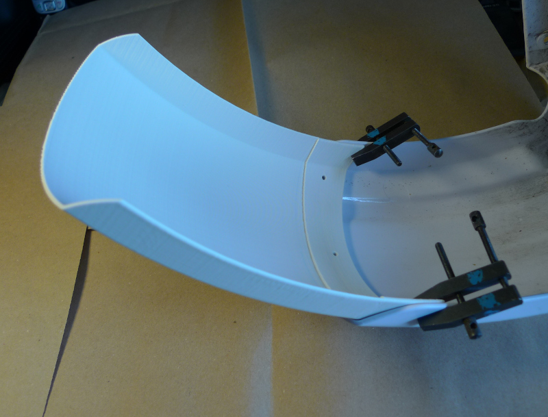 Der Kotflügel und die daran befestigte Verlängerung werden sich biegen und verwinden. Durch den Fahrtwind und manchmal auch durch Stöße. Ich befürchte, dass sich die Nieten ins weiche PETG-Material einarbeiten und locker werden. Deshalb soll die Hauptbefestigung durch Kleben erfolgen, die Nieten sind nur zur Sicherheit.