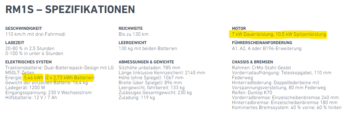 133Kg fahrfertig, 230Kg zulässiges Gesamtgewicht??? Soll ich ohne Helm und Klamotten fahren?Gearsen hat geschrieben: Mo 6. Mai 2024, 22:52 Das werden sie bei der RM1S wohl müssen, sonst bekommt man bei zusammen gerade mal 5,46 kWh Energieinhalt die 7kW Dauerleistung, respektive 10,5 kW Spitze, wohl kaum hin.