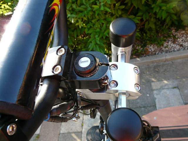 + Stoßdämpfer Attrappen aus Alurohr professionell am Lenker befestigt, ohne Veränderung oder Beeinflussung der Fahreigenschaften, sieht cooler und robuster aus. Könnten aber ohne Probleme wieder entfernt werden.