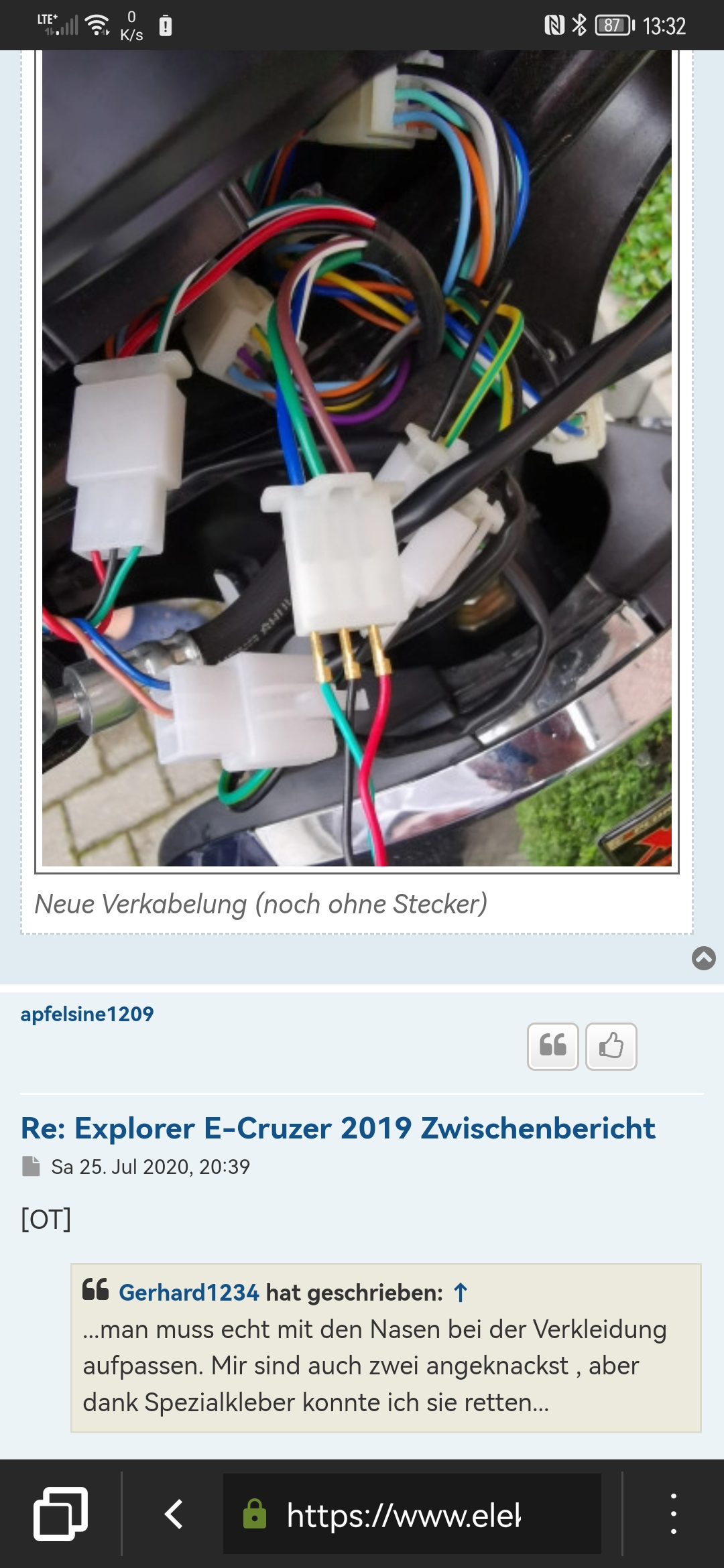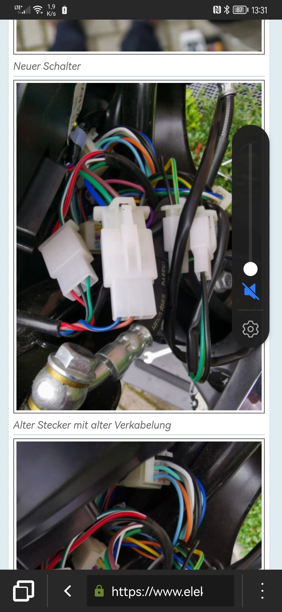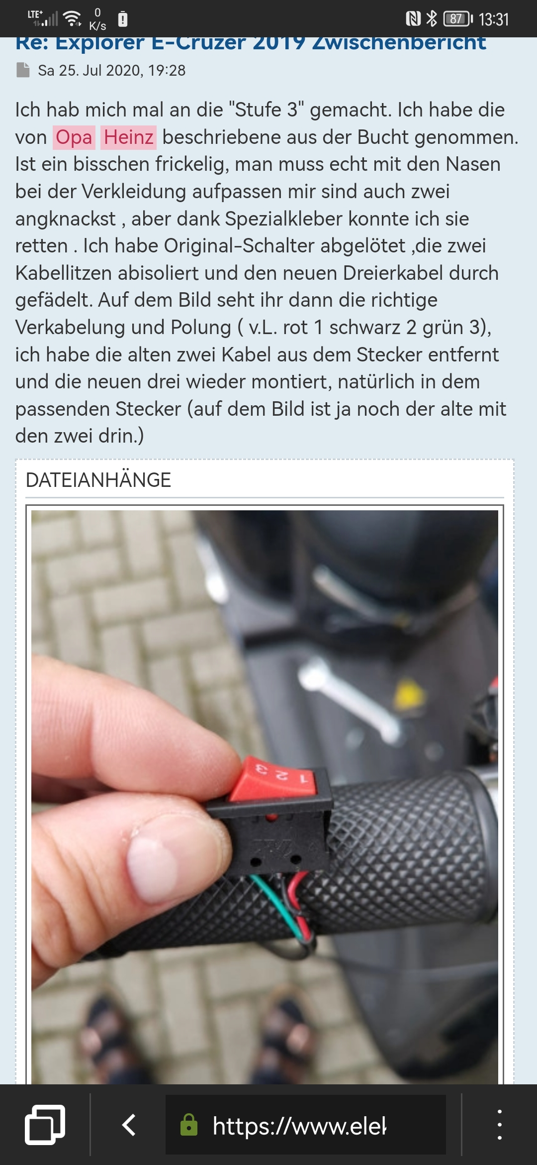 PS zum Zwei-Fach-Schalter: Wenn der Roller im Original bisher nur zwei Fahstufen hat, am Kabel in der Lekerverkleidung aber drei Kabel für einen drei Stufen-Schalter ankommen, von denen nur zwei zum Schalter weitergehen, liegt es natürlich nahe, dass das dritte dort unverbundene Kabel, dass für die dritte Fahrstufe ist. Der Zweifach-Schalter öffnet in der einen Position den Kontakt zwischen den an ihm angeschlossenen Kabeln. Das ist eine der beiden Fahrstufen. Kontaktiert er die Kabel ist das die andere Fahrstufe. Eins dieser beiden Kabel ist Masse/Minus vom Controller mit Durchgangsfrüfer müsste das permanent Kontakt zur schwarzen Masse/Minus-Leitung des throttle/Gas-Griff-Steckers haben (also vermutlich auch schwarz). Wird dieses Masse/Minus-Kabel (zum Schalter) nun mit den bisher ungenutzten Kabel in der Schaltstellung 3 (bei Umrüstung auf 3-Fach-Stecker) verbunden, sollte der Controller auf die Fahrstufe drei umschalten, was ggf. nur auf Privatgelände legal ist.