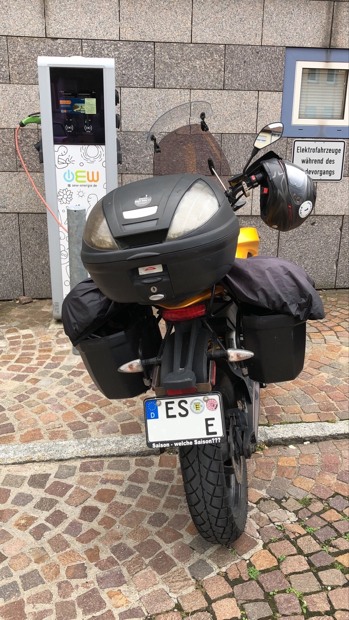 Der erste Ladestopp in Freudenstadt war durchaus enttäuschend. Ich habe voerher bei der Touri-Info gefragt, ob ich die Stationen in der Tiefgarage am Marktplatz nutzen kann - Antwort: "Klar!, Tatsache "Für Motorräder verboten!".