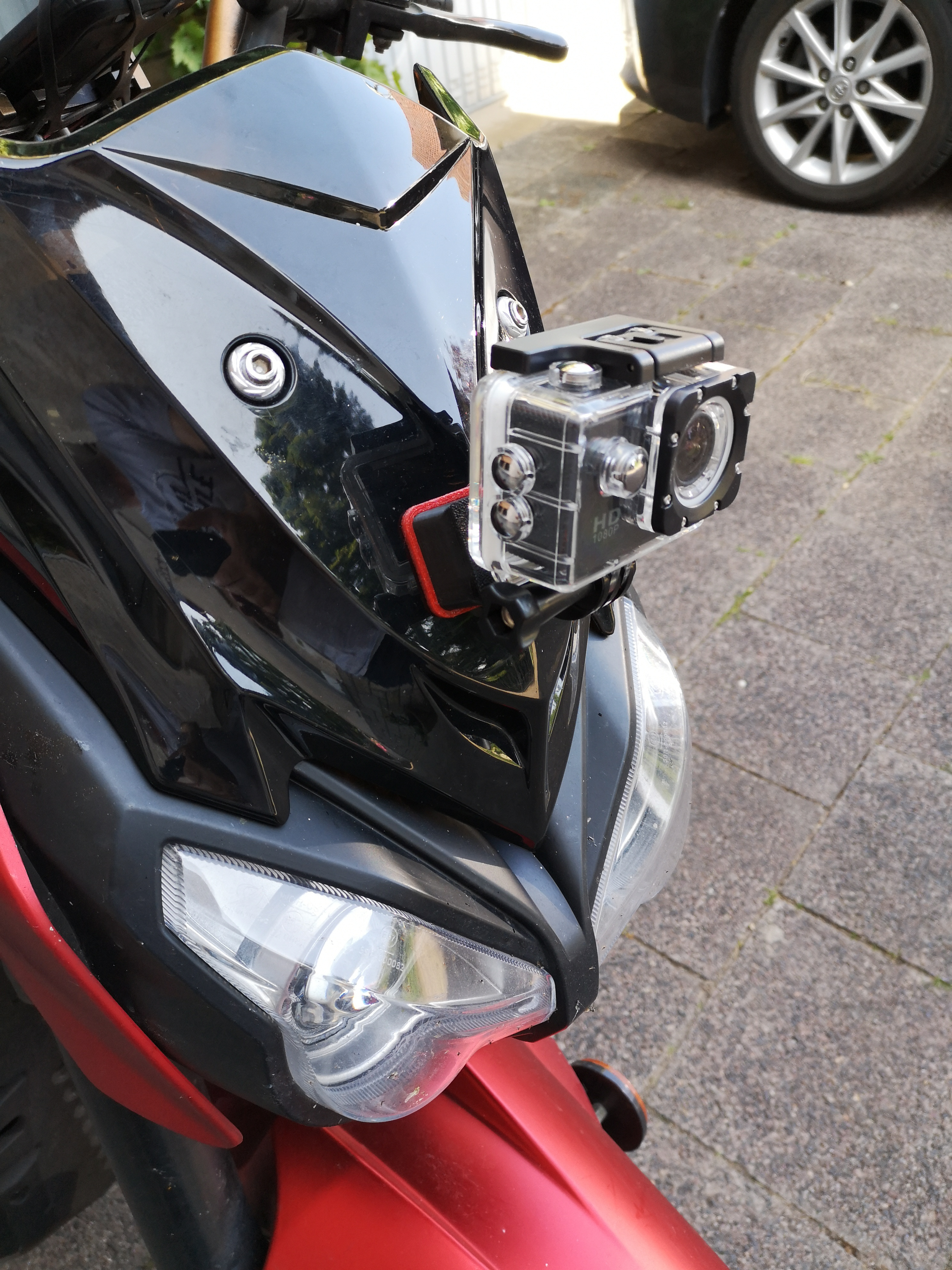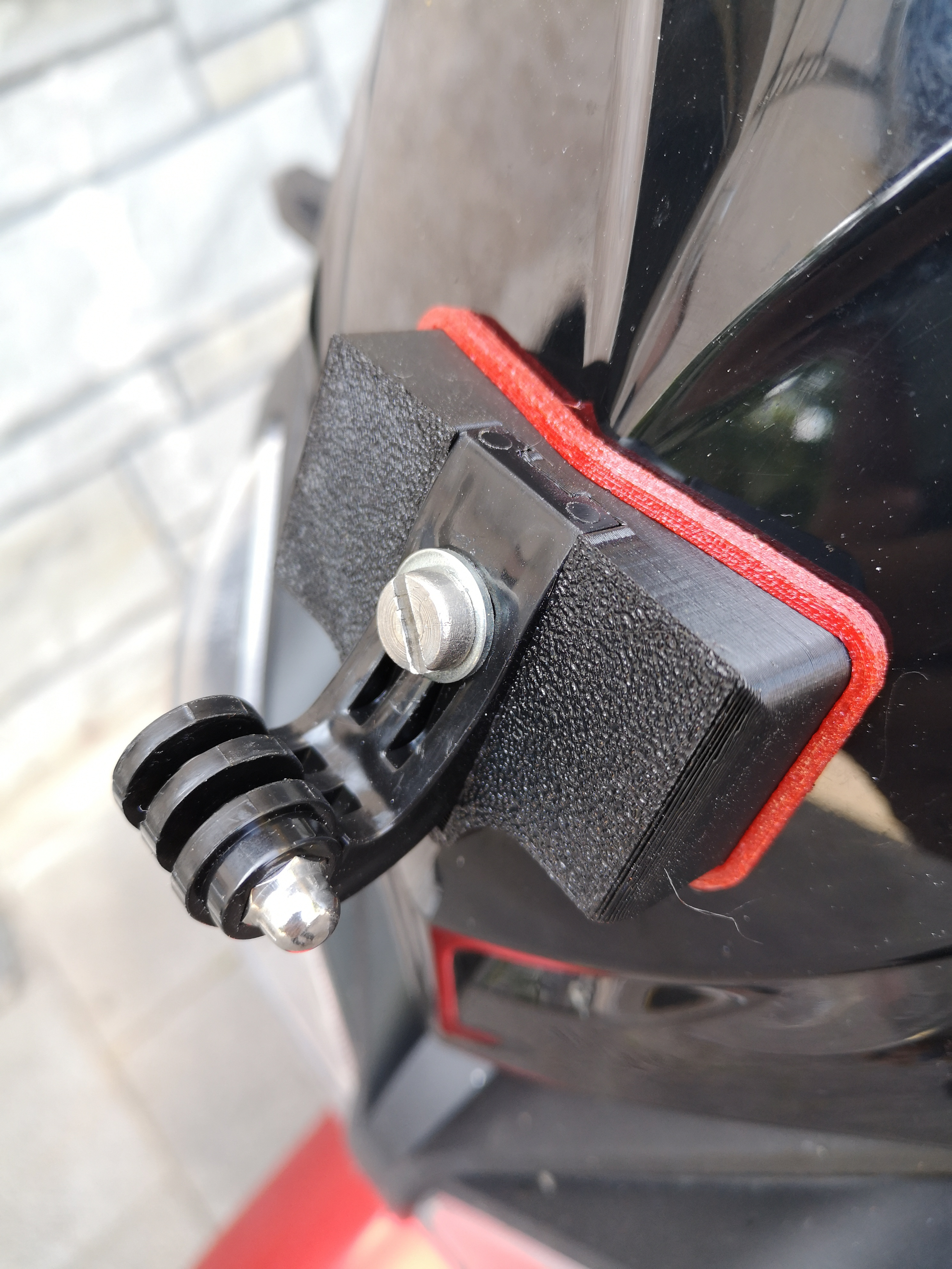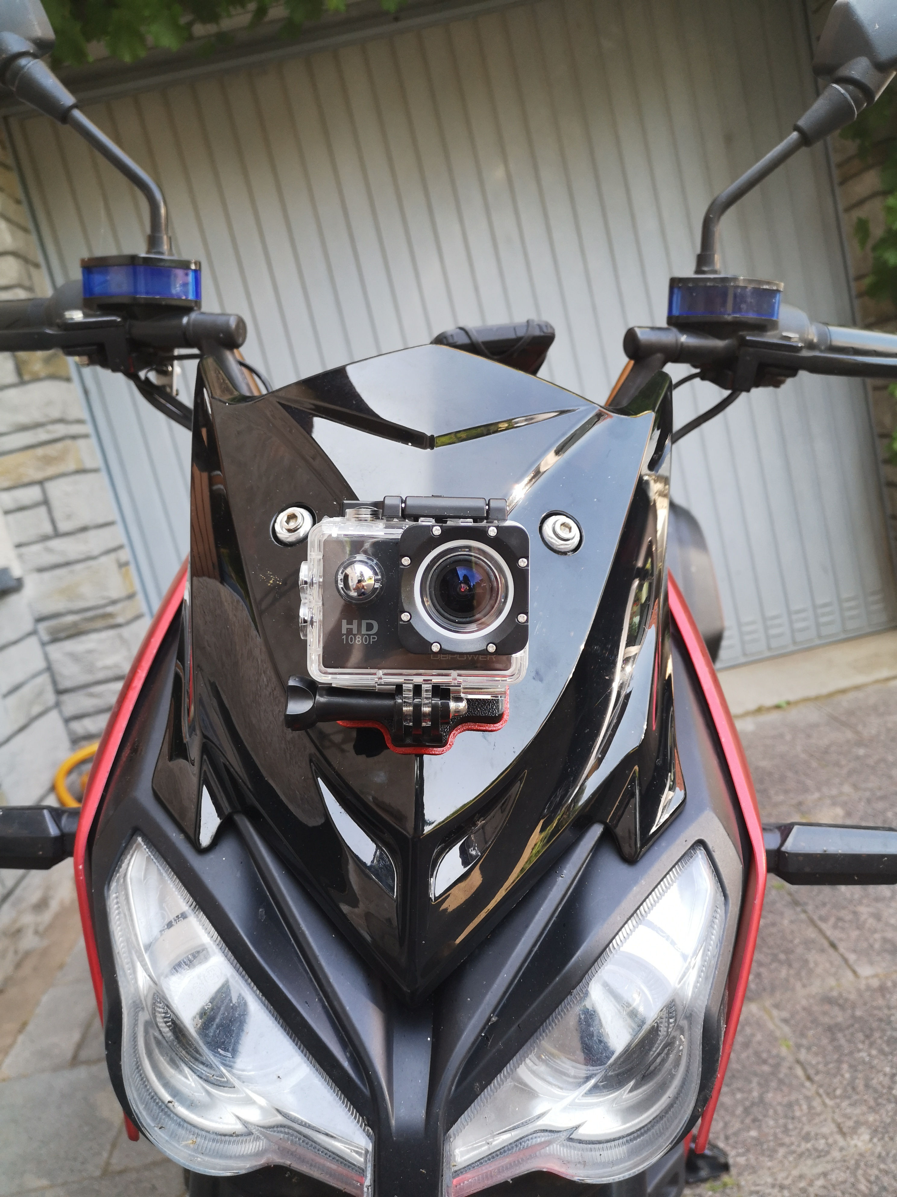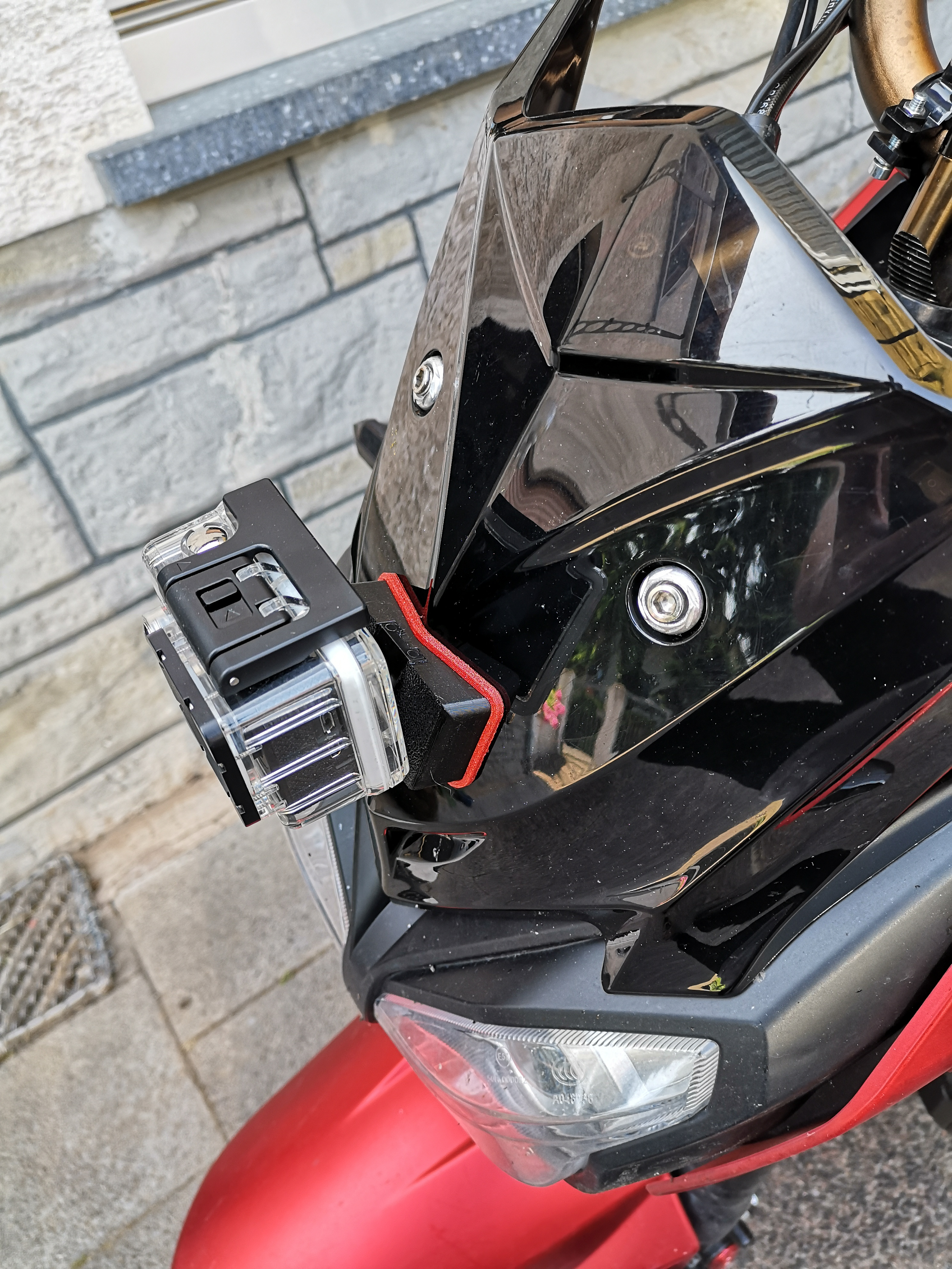stabile Halterung für eine Action-Cam, welche direkt vorne am Windschild, anstelle der unteren Schraube, montiert wird.