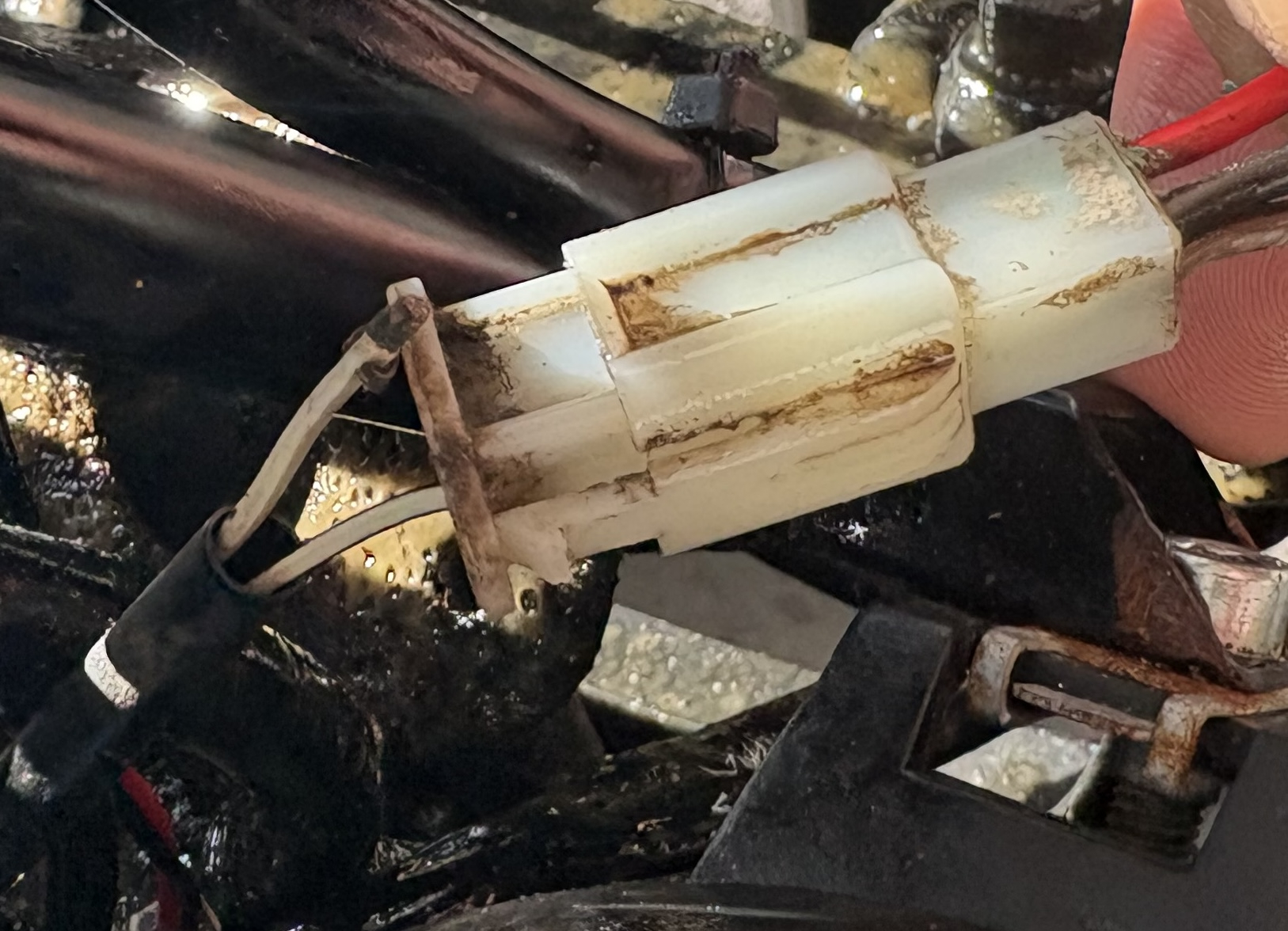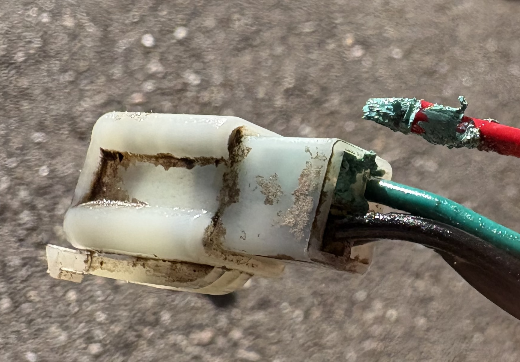 Stattdessen waren die Kontakte im Verbinder zwischen Zündschloss und dem Rest des Mopeds komplett wegkorrodiert! Man konnte das Kabel einfach aus dem Verbinder ziehen, die Kontakte waren praktisch komplett aufgelöst.