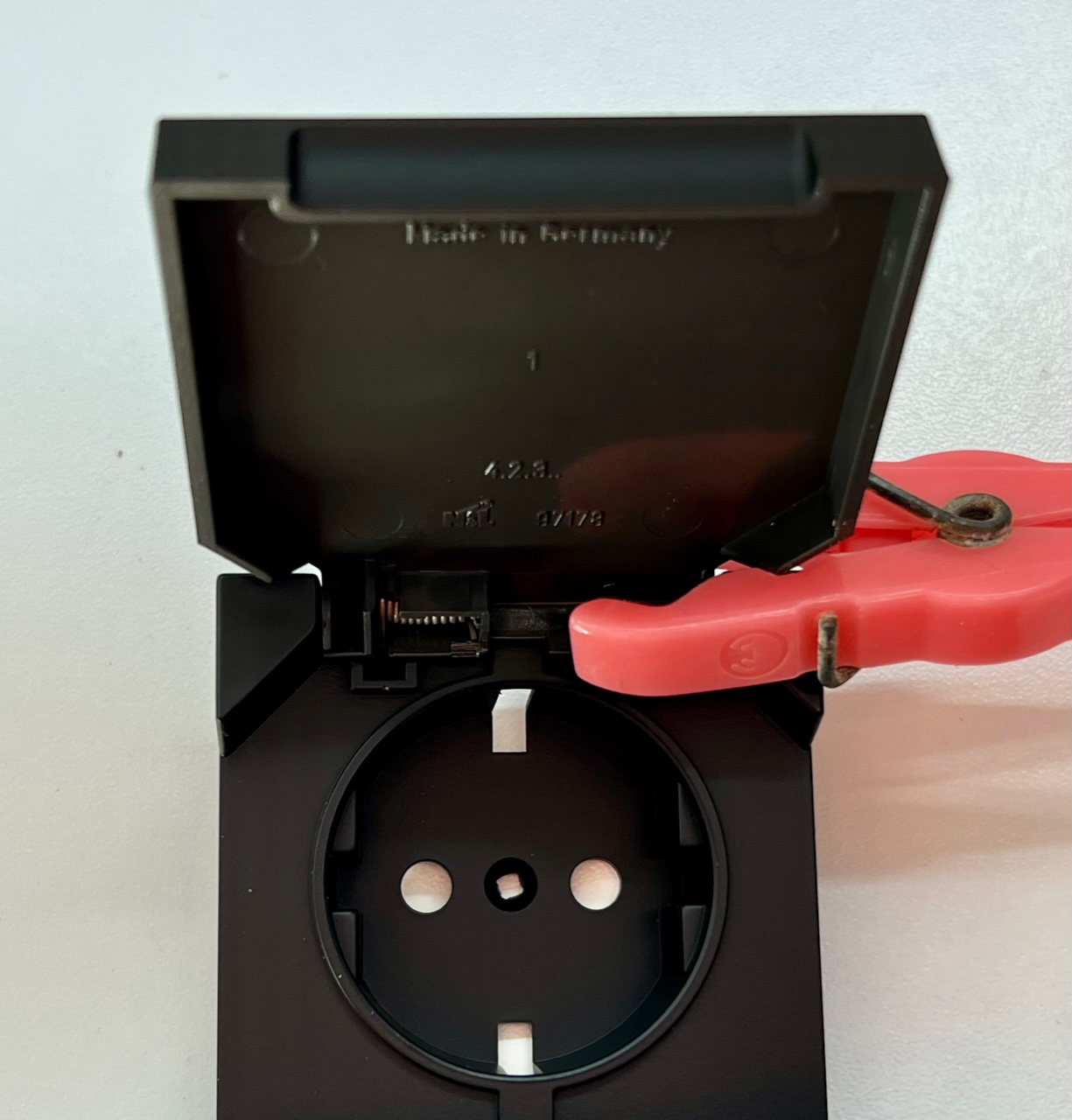 Habe es jetzt anders gelöst mit der innenliegenden offenen Steckdose. Bevor ich mir eine Kaltgerätebuchse (nur Zehnerpack) zwar MIT Deckel, aber OHNE Sicherung kaufe und einbaue (wobei dann das Loch in der Helmwanne ebenfalls zu gross wäre), habe ich mich heute in der Elektroabteilung des Baumarktes für ~6 Eur bedient: Steckdose mit Federdeckel. Muss nur innen die Schuko-Form aussägen, dann kann man den Deckel über der Ladebuchse mit zwei Schräubchen befestigen. Somit neben mechanischem Schutz ist dann die Ladesteckdose auch vor leitenden Gegenständen geschützt, was im Helmfach so herumliegen könnte (nasse Bekleidung, Handschuhe o.ä.) Die Steckdosenklappe träg auch nicht gross auf - Höhe dann final 8mm. E