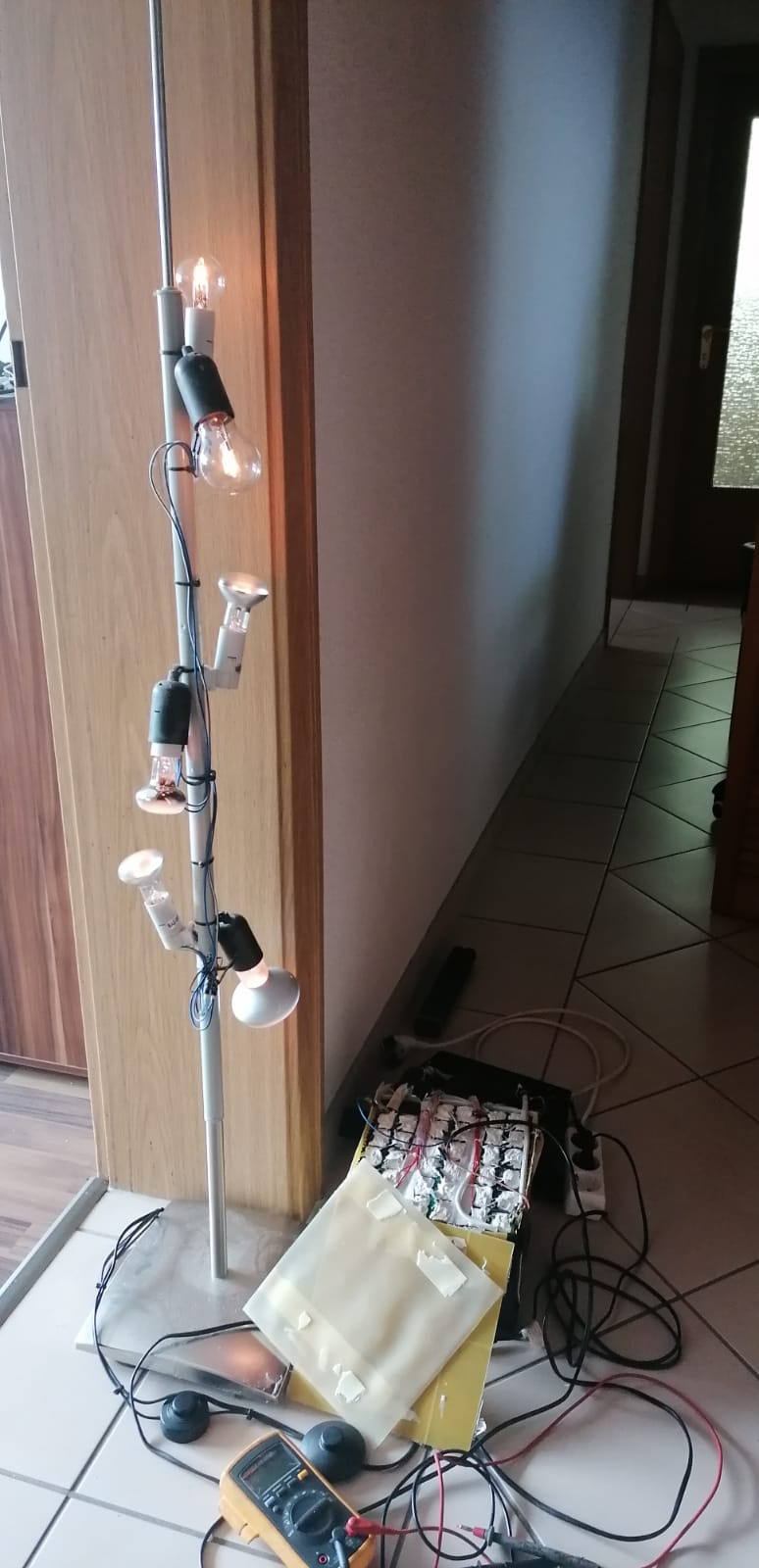 Im Moment muss das hier erstmal als Widerstandsbank herhalten. 330 W bei 230 V. Keine Ahnung wie viel Ampere da gerade fließen.