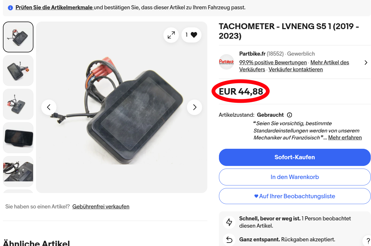 Inoa S5-Li + 2. Akku + 2 Ladegeräte mit je 7A => Original 4A-Lader verkauft. 11/2023 12A China-Ladegerät gekauft und umgebaut. Seit 11/2022 Tuning-Controller verbaut. Windschild (empfehlenswert) seit 03/2022. Gesamtpreis per 01/2022: 2.930 €.