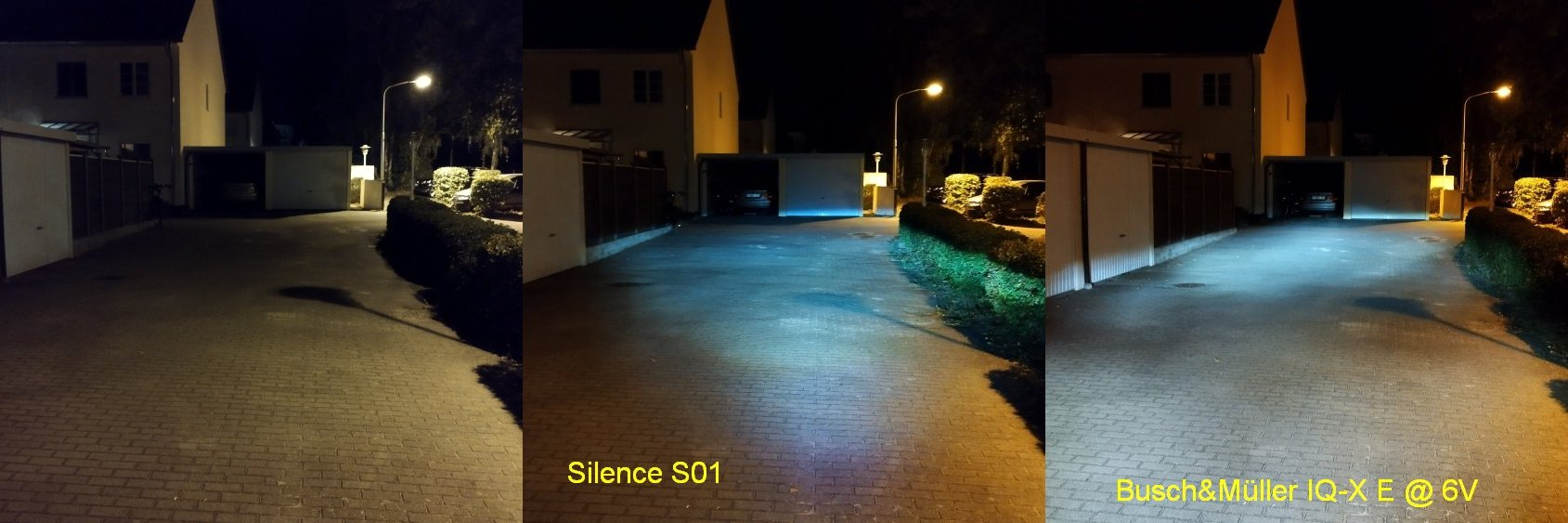 Wie sehr Fotos von der Wirklichkeit abweichen, sieht man ja auch an meinen Vergleichen oben, wo eigentlich nur die im Vergleich dunkler abgebildete Umgebung darauf deutet, um wieviel heller das Medley-Werkslicht ist. Trotz fehlendem Vergleich zum Werkslicht kann ich auf Deinen Fotos einen großen Unterschied erkennen. Allerdings kommt mir die Leuchtweite recht gering vor - bei der erlaubten Neigung sollten schon bis zu 50 Meter Straße gut erleuchtet werden. Ab Werk hatte ich "Rückmeldung" von den für einen Popupradweg hier in B verwendeten reflektierenden Pollern bis zu 200 Meter (was wiederum zuviel ist).