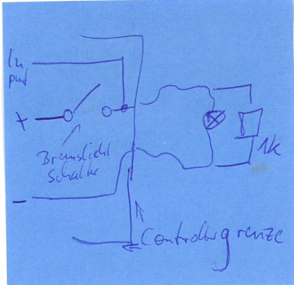 99% (das letzte Prozent sind die E-Mäxe) aller Controller sperren, wenn die Bremse betätigt wird und das Bremslicht leuchtet. Zum fahren brauchen sie aber auch ein 0V Signal vom kalten Bremslichtfaden. Schraubt man die Bremslichtbirne raus bzw. verwendet eine hochohmige LED läuft der Controller nicht mehr.