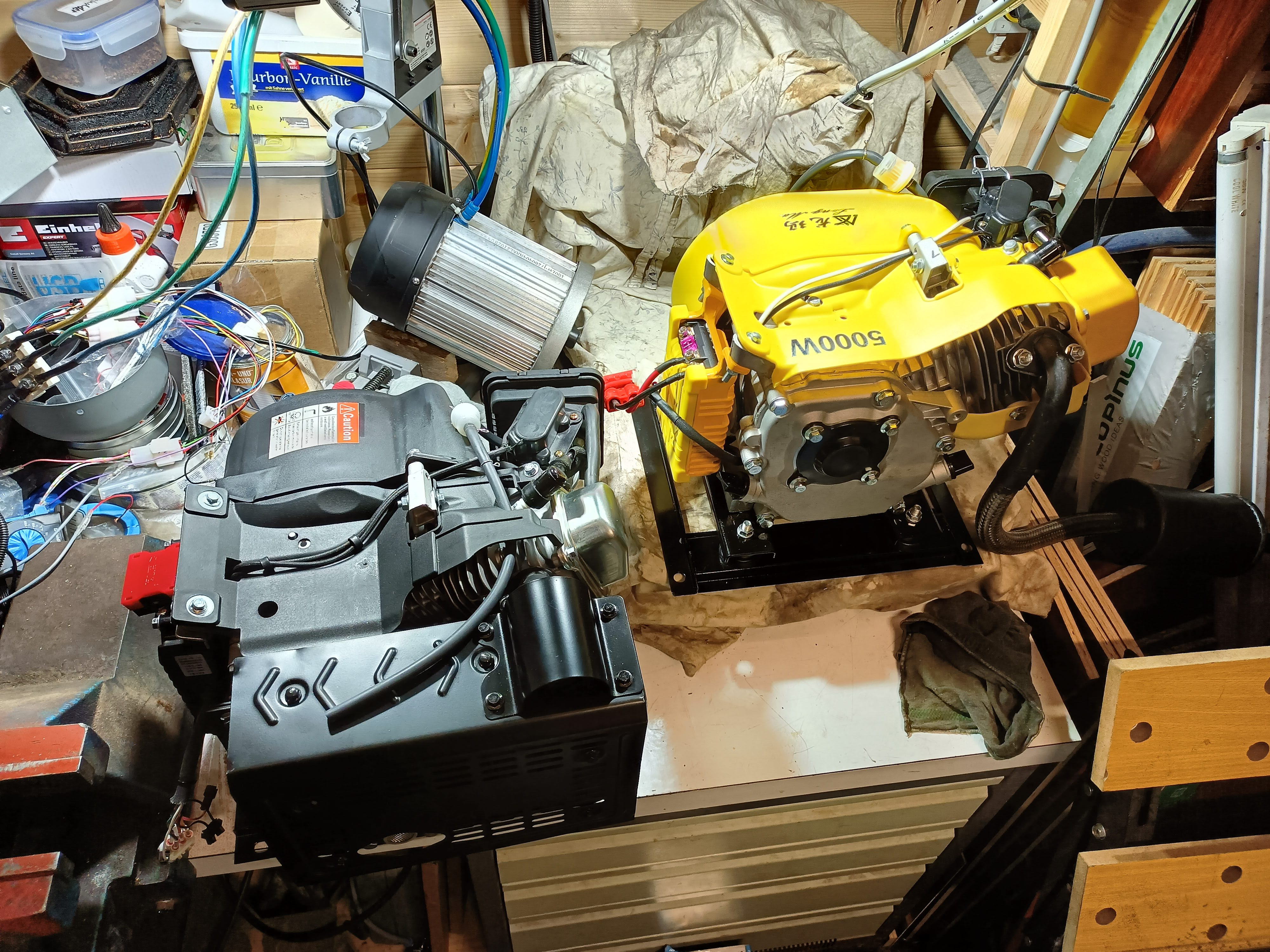 Die Module unterscheiden sich nicht wirklich. Sind bis auf den Auspuff identisch mit anderen Chinageneratoren. Im Big sind die gleichen wie im Max, nur die Aufhängung ist anders. Der Antrieb ist ein chinesischer Nachbau der 4Takt-Hondamotoren GX170, 172 ... . Also das, was da so in besseren Rasenmähern und Schneefräsen seinen Dienst tut. Als Treibstoff geht jedes Normalbenzin.