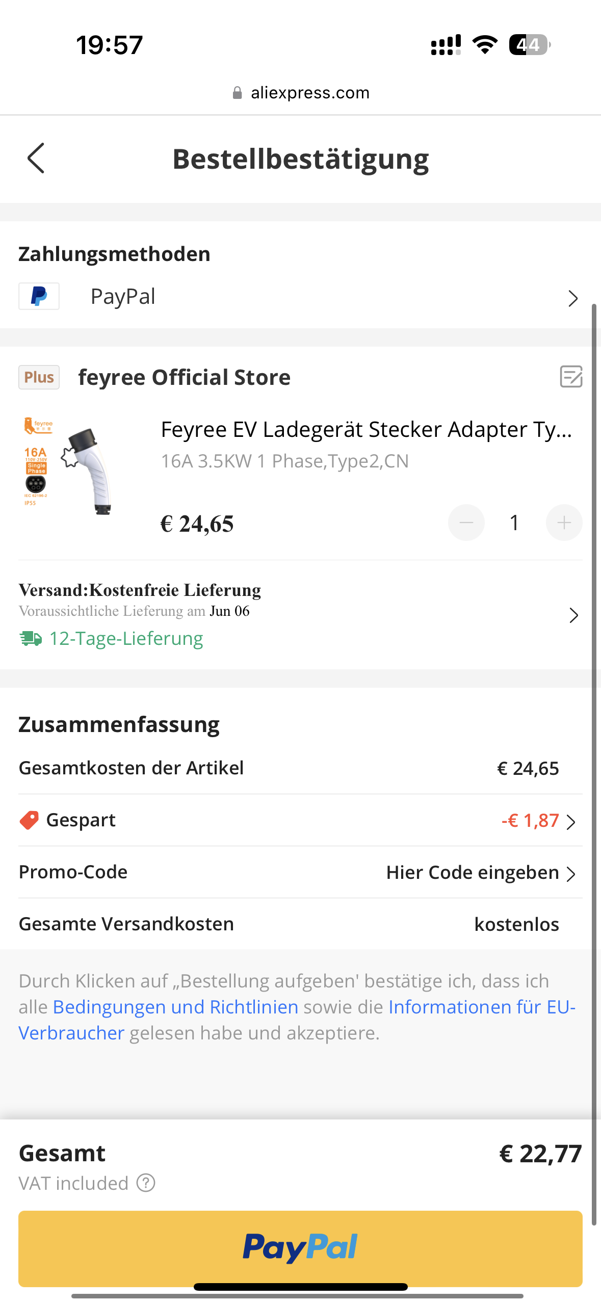 Btw. Einen female Typ-2 Stecker für eine Phase und 16A bekommst du auf Aliexpress für ca. 30€, inkl. Versandkosten, bspw. hier. Auf Amazon latzt Du dafür 75 Euronen, hast dafür das Teil aber 1 Tag später geliefert.