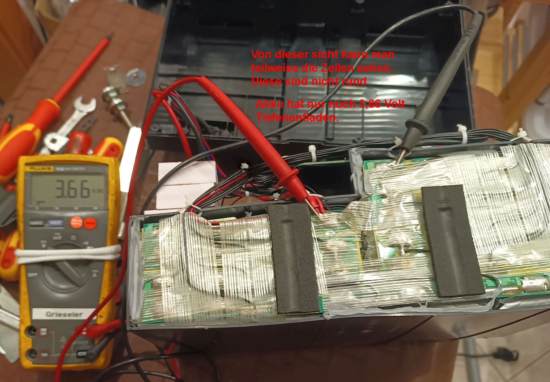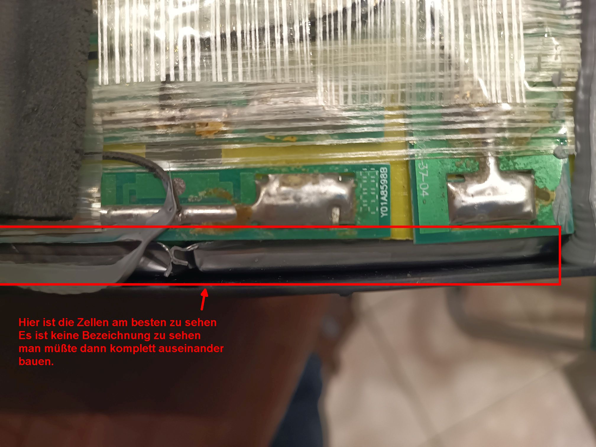 Da defekt habe ich mal ein Akku aufgemacht und war erstaunt das da keine Standard Zellen so wie ich sie kenne Verbaut sind 18650 oder ähnliche, nein es sind Recheckigen ungefähr 7 mm hoch, leider konnten ich keine Bezeichnung erkennen ich wollte den Akku nicht weiter zerlegen (nicht getraut weil man dann doch mechanisch etwas an den Zellen macht). Habe alles in Bilder festgehalten.