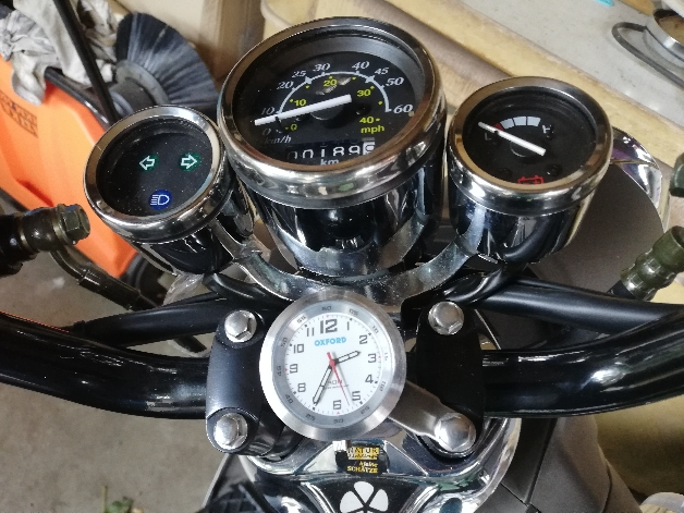 nachdem ich mir Wilfrieds „Clock“ angesehen habe, hatte ich schon vorab ein ähnliches Modell mit einer Universalhalterung bestellt. Mir war schon klar, das Teil passt nicht zwischen Armaturenhalterung und Lenkerstange. Gerade mal 6mm Platz ist dazwischen und meine Lösung war mal wieder der steinige Weg zum Erfolg mit einer angepassten Halterung. Das Ergebnis: Bewaffnet mit einer Drehmaschine und Oberfräse aus einen Stück Aluminium etwas zu konstruieren was wunderbar passt. Dazu sollte es einigermaßen zu der Instrumentierung passen. Die Vorarbeiten.... Mit der Oberfräse wird es ausgefräst, dass ist leichter als es auszudrehen. Eigene Maßvorgaben. Da sind natürlich einige Arbeitsschritte übersprungen. Gewindebohrungen etc. Die fertige Halterung, ich meine es passt wunderbar zum eRetro. und so sieht das dann aus wenn es montiert ist.