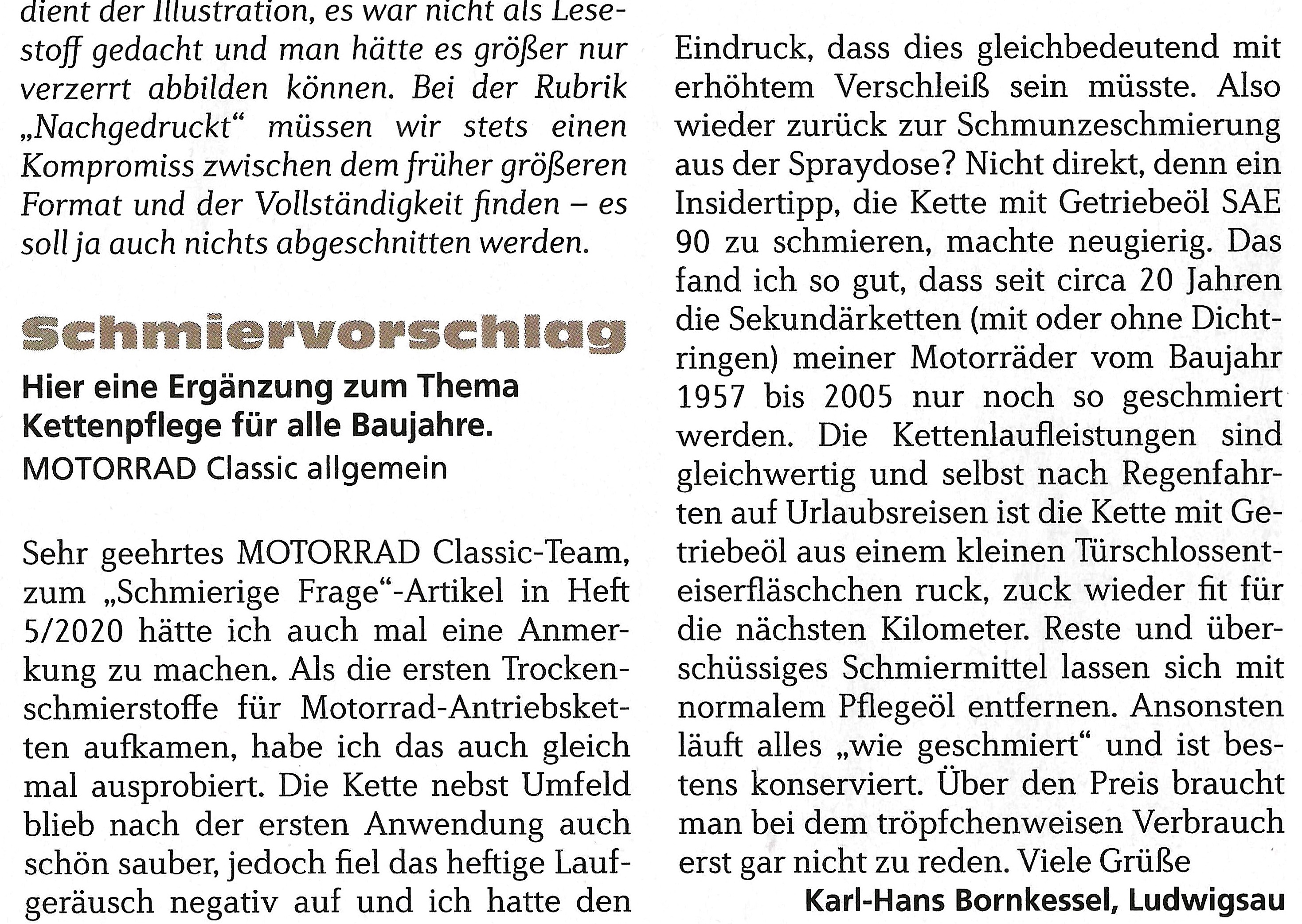 In der Motorrad Classic Nr. 6/2021 las ich den unten abgebildeten Leserbrief. Damals dachte ich mir wenn ich noch mal ein Zweirad mit Kette haben sollte dann mache ich es auch so.