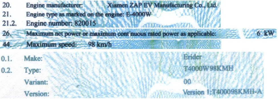 wirst du da schlau draus? Motortype E-4000W, max. continuous rated power 6kW, max speed 98 km/h... Typ T4000W98KMH (sehr einfallsreich ;-) ). von einer Spannung steht da nix. Ich würde aber mal vermuten es ist der 4000W Motor, weil es einen 6kW Sportivo wohl nicht gab. Allerdings eigentlich auch keinen 4kW mit 98 km/h (aber er fährt ja auch nur gute 80). Alles komisch.