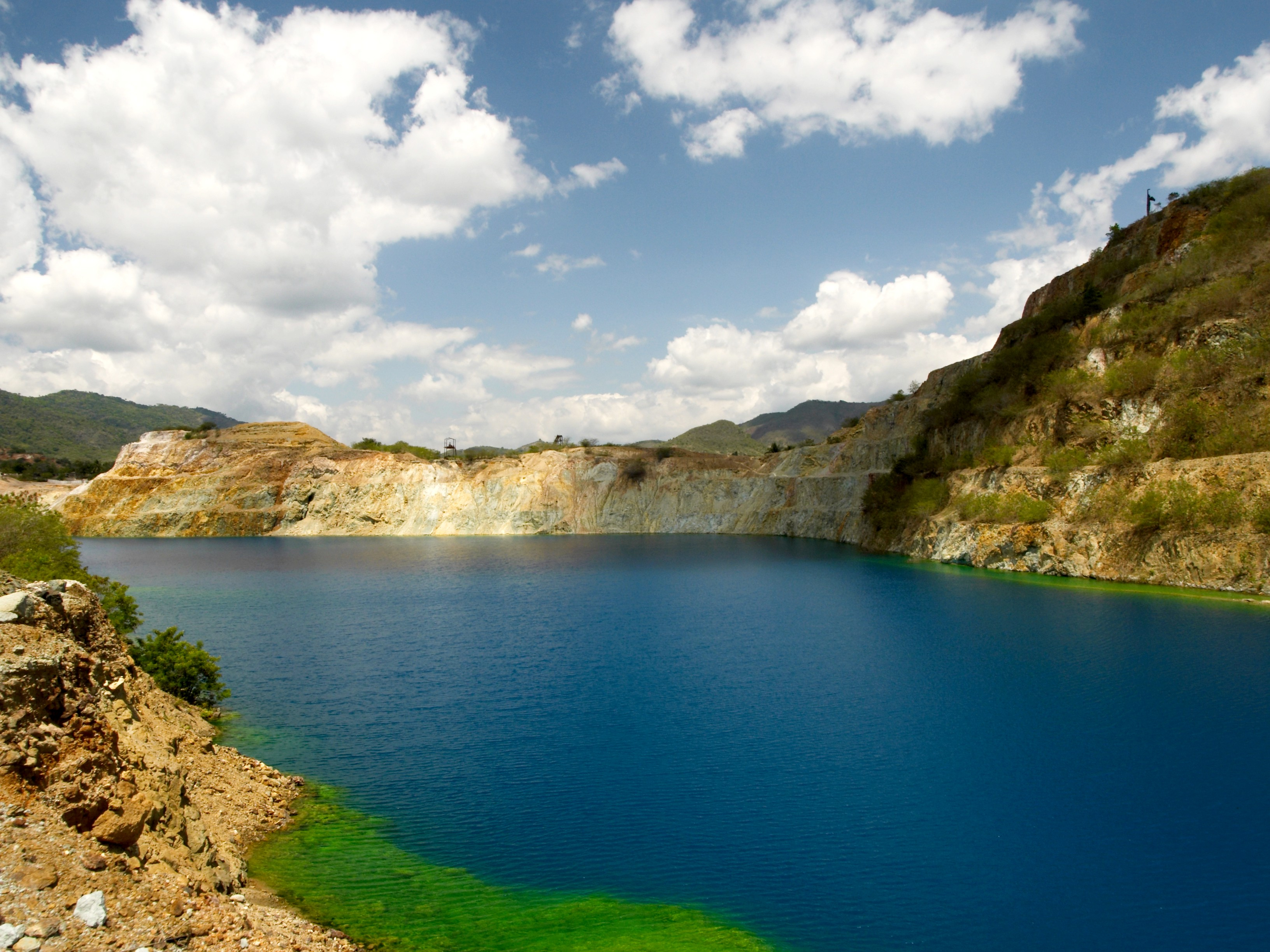 Das hab ich vor 15 Jahren fotografiert. Ist ein ehemaliger Kupfertagebau. Der ganze See changiert zwischen grün und blau (kommt auf den Bildern schlecht rüber). Das kommt von den Kupfersalzen im Wasser. Kristallklares türkisfarbenes Wasser. Wasserpflanzen oder Fische waren nicht zu sehen.