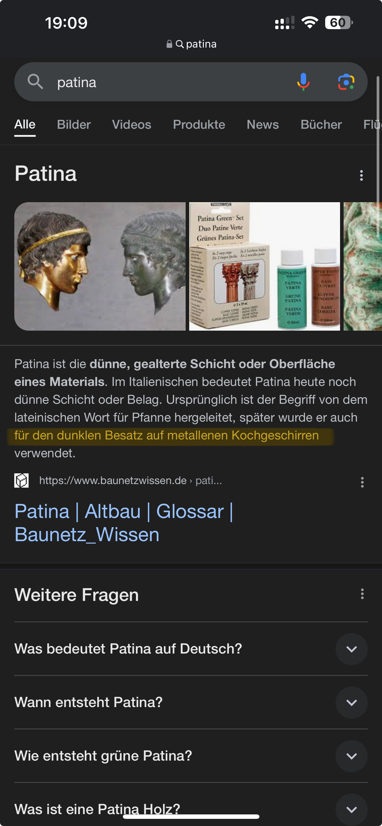 Patina ist jeder "Dreck", der sich mit der Zeit auf ein anderes Material drauf legt. Wenn Du eine Pfanne brünierst, ist das m.E. keine Patina. Wenn ich eine Pfanne regelmäßig benutze und nicht exakt reinige, bildet sich eine Patina.