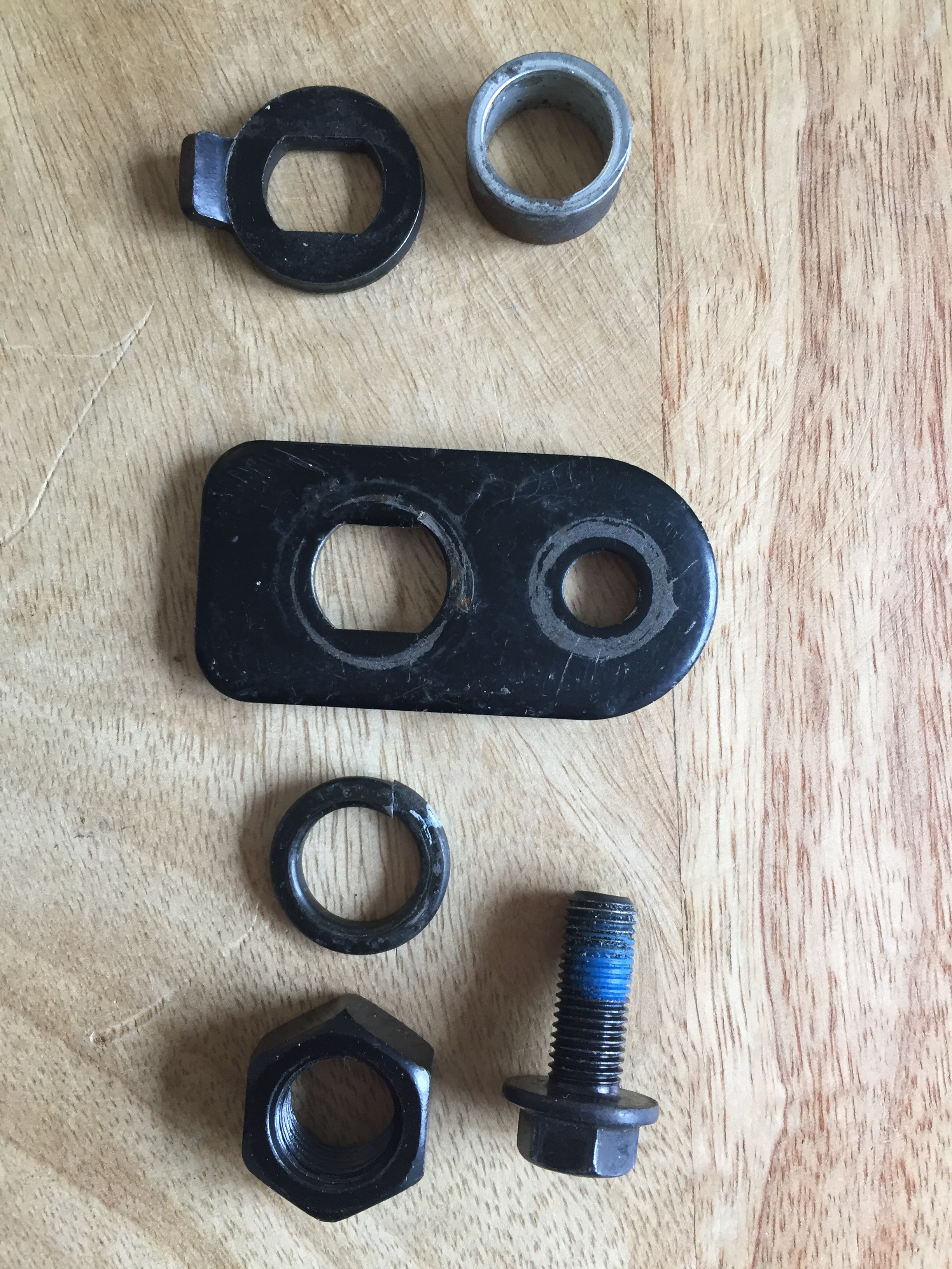 Dein Bild ist etwas schwierig einzuschätzen. Mir kommt Nr1 schon etwas komisch vor. Normalerweise gehört auf die Motorachse als erstes eine Unterlegscheibe mit abgeflachter Bohrung, welche sich am Übergang von "abgeflacht zu rund" abstützt und das Gegenlager zur Achsmutter bildet.