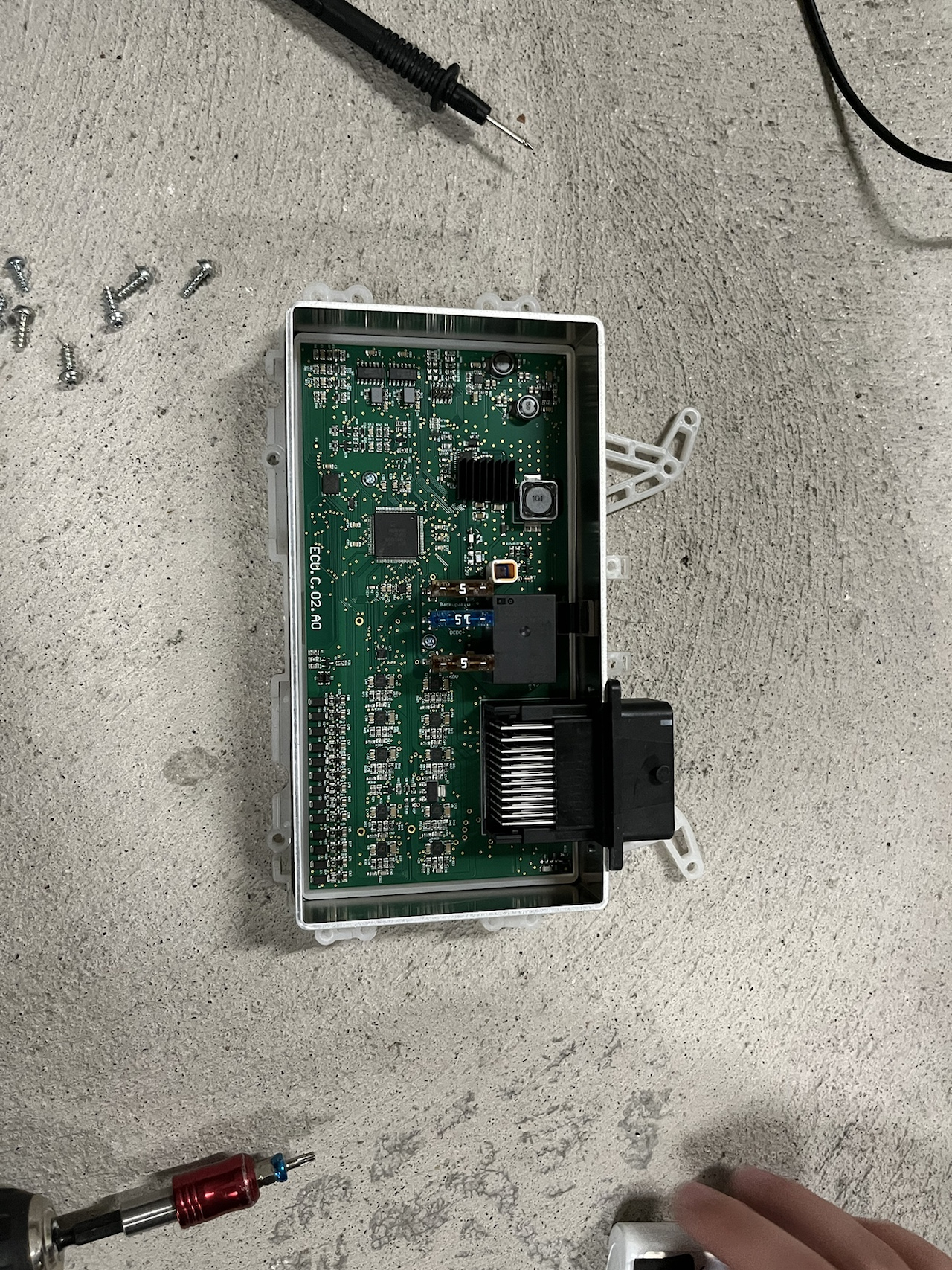 Hier Das Bild der Platine/steuergerät im geöffneten zustand, der Akku wird rechts von der oberen 5a Schmelzsicherung eingesteckt (man sieht die orange Dichung der buchse einwenig) Das Steuergerät sollte vorsichtig geöffnet werdem, da der Akku auf dem Deckel des Steuergerätes monitert ist, reissen könnte die Buchse beschädigen. (keine Angst, einfach vorsicht...)