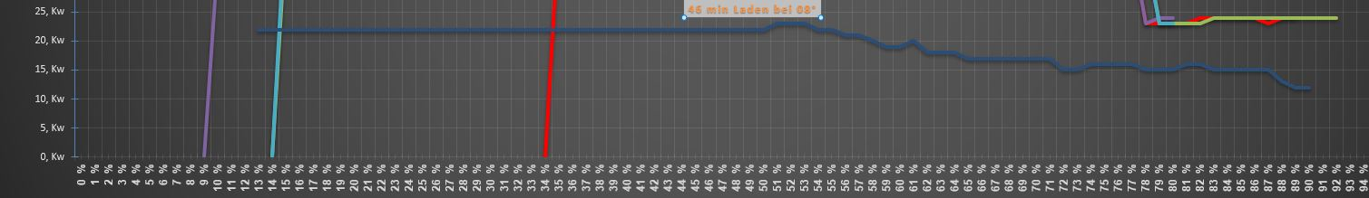 Je nach Temperatur und Fahrstil sehe ich bei der ersten DC-Ladung auf längeren Strecken sogar 22kW bis um die 75%. Wenns schon ab 50% drosselt, dann war's entweder heiß, oder lange schnell gefahren, oder schon die 2. DC-Ladung.