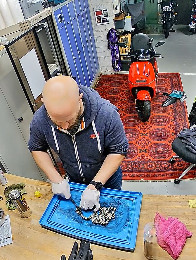 Also ich lasse zum Reinigen die Kette eingebaut und nehme ein Tuch das ich mit Ballistol tränke. Das Tuch dann mit Druck um und fest an die Kette gepresst halten und das Hinterrad drehen. Zum Schmieren das High End Kettenspray von Dr. Wack (das war ein Tipp aus dem Forum) auf die Innenseite der Kette sprühen. Dazu stelle ich die Wanne im Link unter und decke den Reifen mit einem Stück Pappe (ca. 23cm * 28cm) ab.Giulius77 hat geschrieben: Do 4. Jul 2024, 08:07 Wie kann ich die Kette richtig reinigen? Muss ich es demontieren? Was benutzt du zum Schmieren?