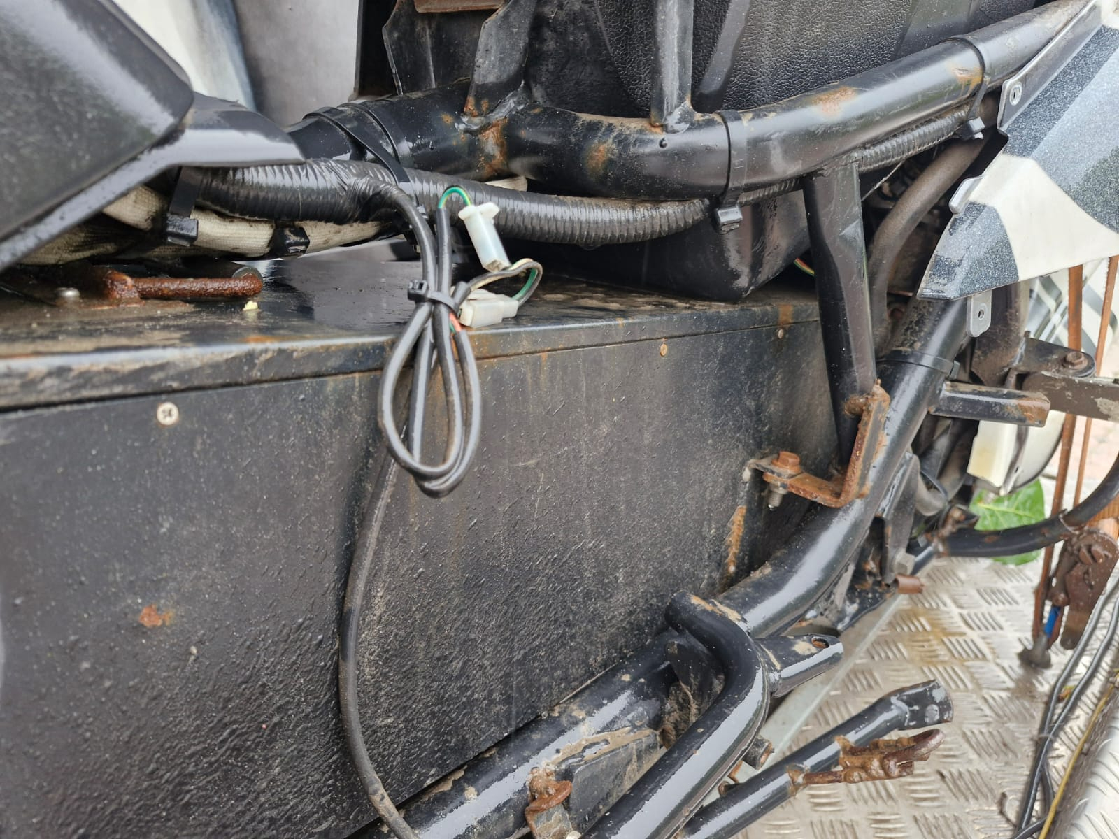 Das ist ja mal Heftig . Als erstes gleich den Akku abstecken ( Grauer Stecker mit Schwarz / Rot Kabel ) , dann alles von den "Schönen Kanadischen Straßenstaub " befreien . Spannung am Akkustecker messen . Würde versuchen mit einer Externen Stromquelle den Akku zuladen . Ich habe dazu ein Solarpanel mit MPPT Regler so 300 -400 Watt . Die können dann ein paar Tage arbeiten . Staub , Wasser , Strom das ist keine Gute Mischung :shock: . Der Akku ist in der Schwarzen Kiste . Wenn da nur die Kabel für den Akkustecker rausgehen ist das BMS ( falls vorhanden ) in der Kiste .